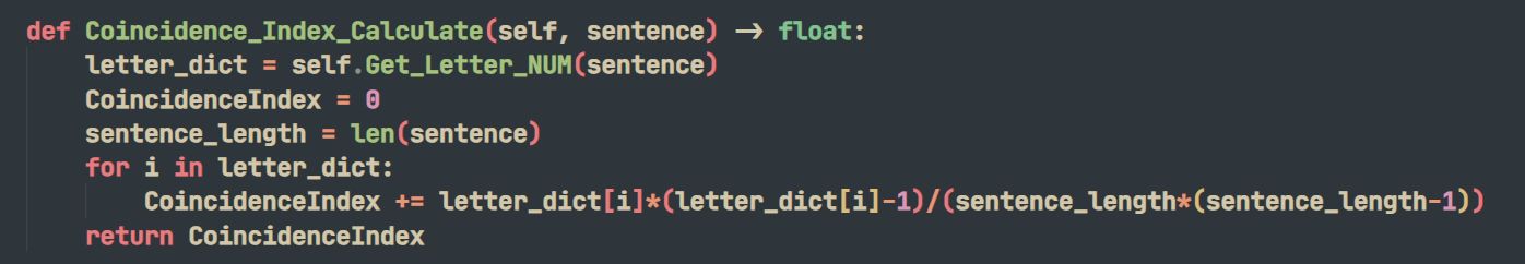 在一個正常語義的英文文本中,和一個無意義亂序的英文文本中,字母出現次數的統計特徵是有明顯差異的,可以利用這種差異來幫助我們自動化的破解密碼。回到1.2中的字母頻率圖,拿其中頻率最高的"e"舉例子,字母e在英文文本中出現的概率約爲12.68%。易得我們在文本內任選兩個字母都是"e"的概率爲12.68%^2。類似的,對於任一概率爲P(i)的字母 i,隨機選取兩個字母后都是 i 的概率爲P(i)^2。在一串無規律的字母中,我們隨意抽取兩個字母,由於每個字母被抽到的概率相同,因此抽取的兩個字母相同的概率爲26*(1/26)^2=0.0385。
