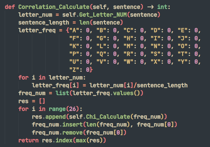 將26×L的向量組與1×26的自然語言字母概率進行卷積 Correlation(Pk,Q)=SUM[p((k+1) MOD 26)q(i)],其中最大的值所對應的爲該組密文的偏移量。