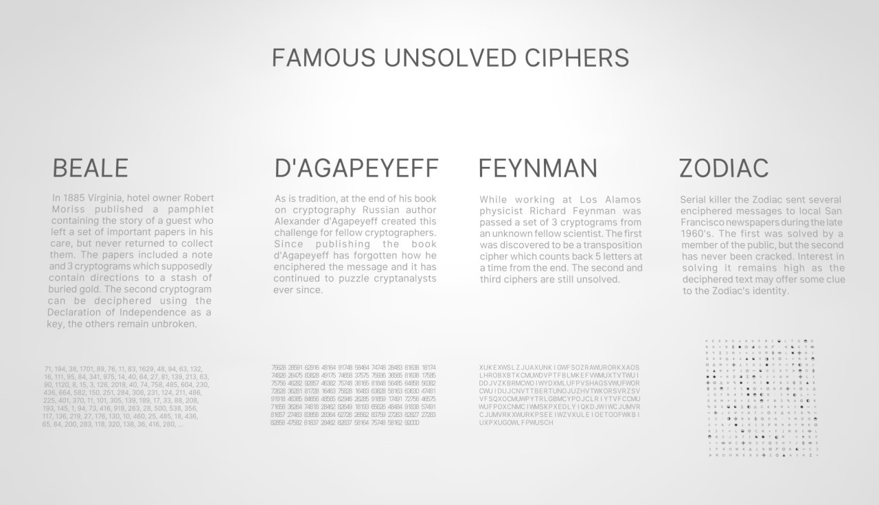 1885年的弗吉尼亞州,旅店店主Robert Moriss出版了一個小冊子,裏面講述了他的一位客人讓他保管的一些重要文件,但是那位客人再也沒有回來取走它們的故事。這些文件包含了1份註釋和3份密文,據說包含了被掩埋的黃金藏匿處的方位。第二份密文是以《獨立宣言》作爲密鑰,已被破譯,而其他兩份至今仍未被破譯。
