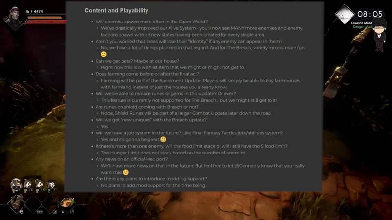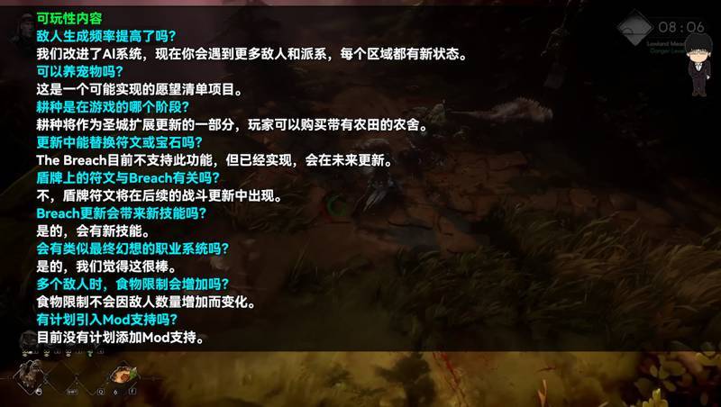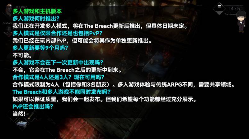 首先是大家非常關注的聯機模式,聯機模式在3月12日官方公佈的宣發視頻裏已提及,會於“The Breach”版本推出後的下個版本推出。430版本後的下個更新時間還未確定,聯機模式會優先推出PVE模式,PVP會在之後的版本更新單獨推出。根據托馬斯的答覆,“The Breach”之後的版本更新至少不會像去年那樣遙遙無期。多人模式將支持最多4人聯機,共享國度、同時具備友傷機制,細節在問題中未提及,但很早官方就已官宣了