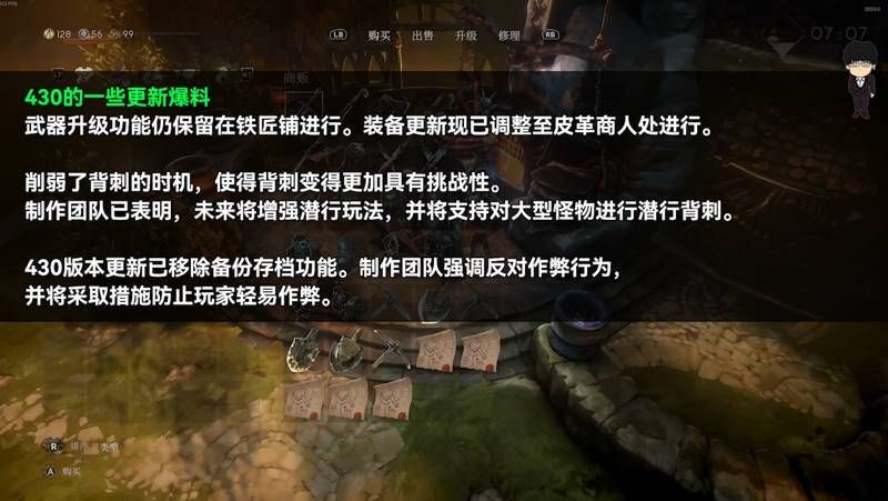 430版本裝備升級方面,武器依舊找鐵匠,防具會調整到皮革商人那,戰鬥方面容易觸發的背刺會提升難度,這下估計手殘黨玩家要哭了。不過沒關係,老基德依舊會推出手把手攻略,爲大家保駕護航。同時430之後的版本還會推出潛行玩法,並支持大型怪物潛行背刺功能,類似《怪物獵人荒野》起手的奇襲攻擊