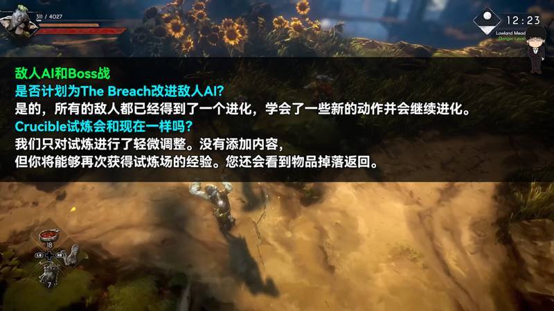 可玩性方面, 老版本玩家屬性過高導致敵人刷新時間太長,新版本改進了AI,演示的時候也表明會有更多敵人和派系,不同區域都會有特色敵人出現。生活方面,寵物系統目前看還在萌芽期,農田系統根據430版本公佈的聖城南方新地圖“低地草甸”,搭配低語傳送點出現的莊園選項,基本可以確定會在430版本推出部分功能。喫喝緊缺問題會得到大幅緩解