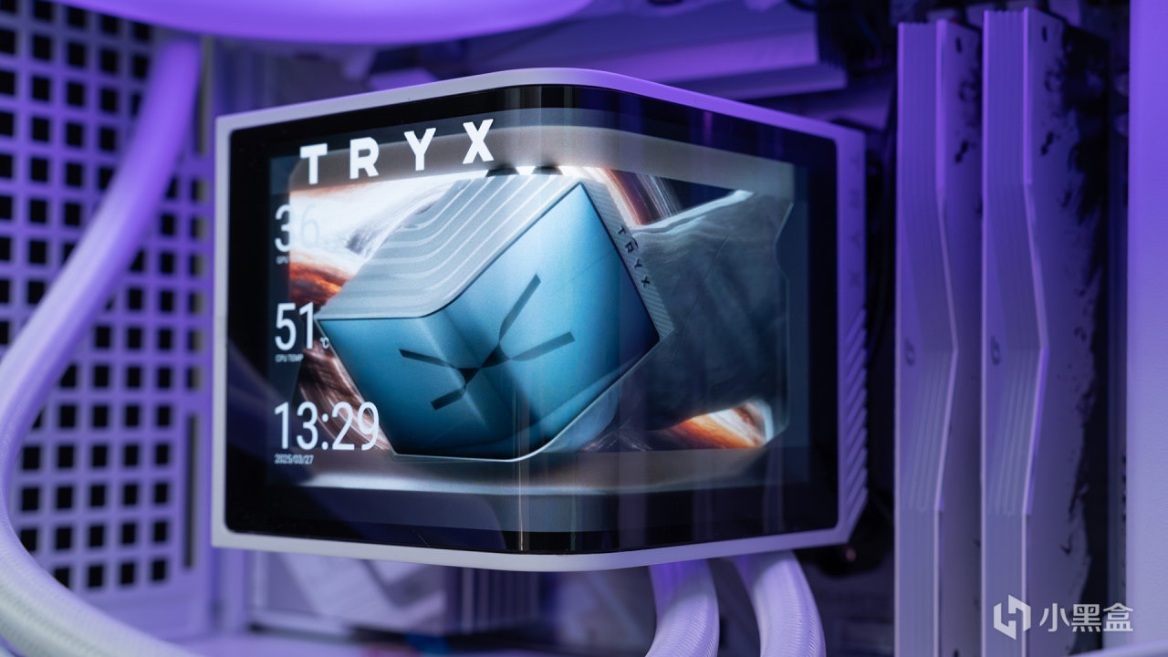 TRYX創氪星系展域SE 240 ARGB整體點亮效果,可見曲面屏幕帶來的全新3D視覺效果,彷彿是把熱門商圈的裸眼3D大屏縮小後搬進機箱裏一樣。