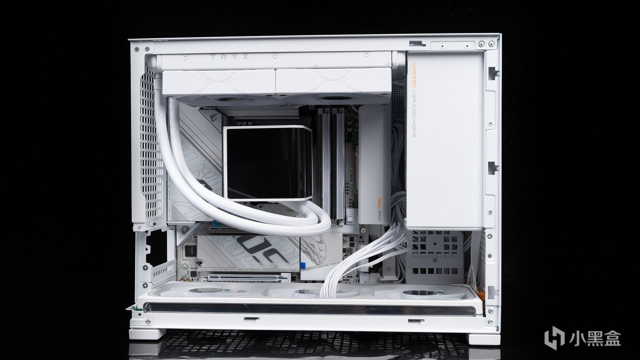 整機內部,採用目前相當緊湊的MATX主流結構——前置電源、頂置最大240水冷、最長365mm顯卡甚至支持MATX背插方案,如上圖所見,內部空間利用率基本達到了100%,如果非要挑剔的話,那隻能說機箱尾部其實還可以安裝一枚120mm風扇,不過這需要把水冷管位置換一個方向。