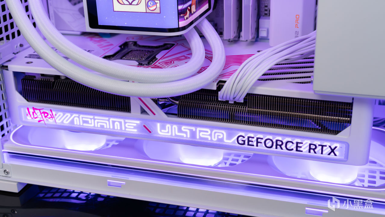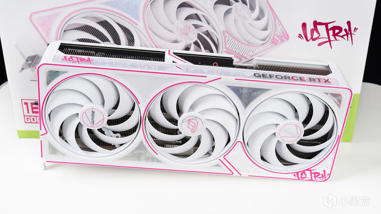 本次裝機顯卡源於七彩虹這款iGame GeForce RTX 5080 Ultra W OC,它採用了Hip-Hop嘻哈藝術風格打造,獨特的粉紅線條設計、半透明鐳射區域再結合,能帶來一種前所未有的“視覺”律動,正面採用三顆雙滾珠軸承的環型風扇設計,支持正逆旋轉和智能啓停。