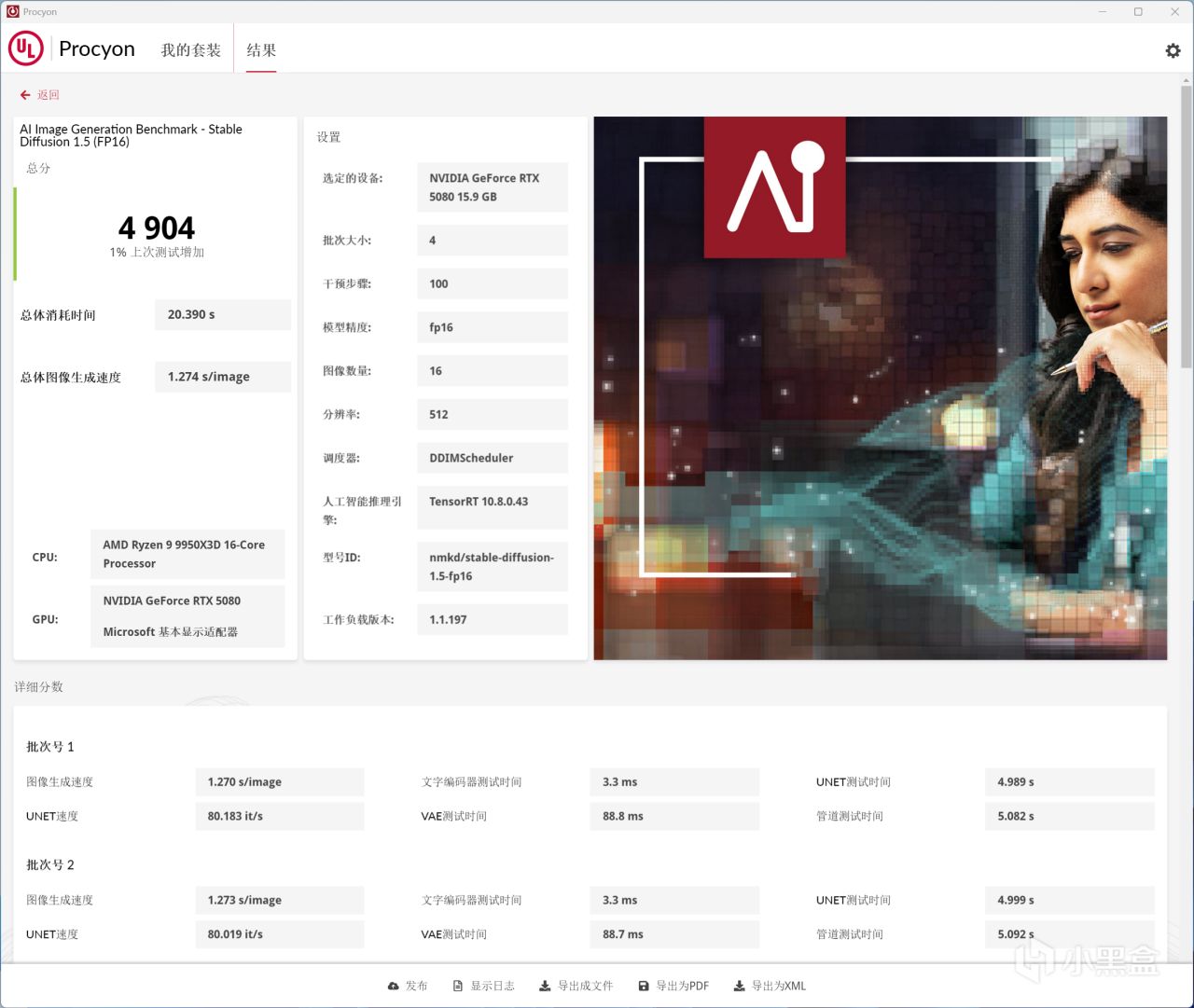 iGame GeForce RTX 5080 Ultra W OC在UL Procyon的AI Image Generation Benchmark SD1.5(FP16)文生圖測試中同樣強大,創建16幅分辨率爲512X512圖像,每批次4幅,利用NVIDIA TensorRT加速,總體耗時僅20.39 s,圖像生成速度爲1.274s/image,基本上就是秒出圖。