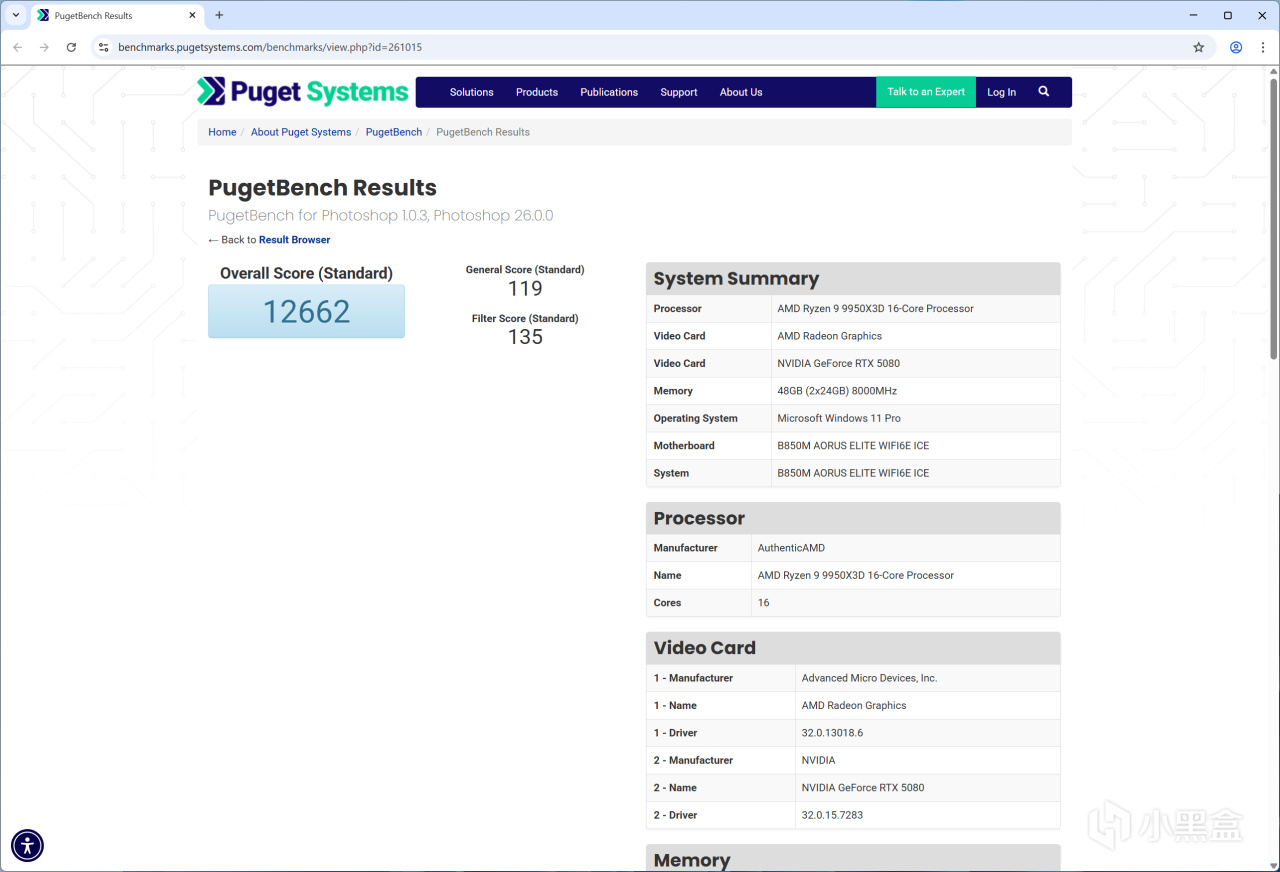 PugetBench Photoshop得分12662,PS是極其依賴CPU單核、其次看重內存性能的圖像處理項目,銳龍9 9950X3D憑藉着擁有全系銳龍最高睿頻,和9950X齊名斬獲該項目的冠軍頭銜,戰績可查當然不包括超頻~