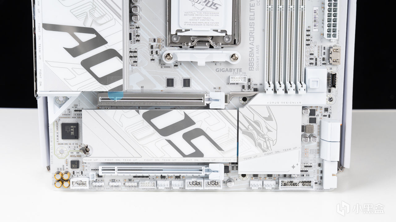 主板就是技嘉這款B850M AORUS ELITE WIFI6E ICE冰雕,和其他B850M首先一判高下的就是它採用了真正意義的純白主題,白色區域不僅包含PCB和散熱裝甲,而且覆蓋了卡扣、插槽、接口一切可處理的元件。其他部分,它在散熱裝甲上採用了AORUS鏡面LOGO和素描圖案,觀感和質感都不錯的。