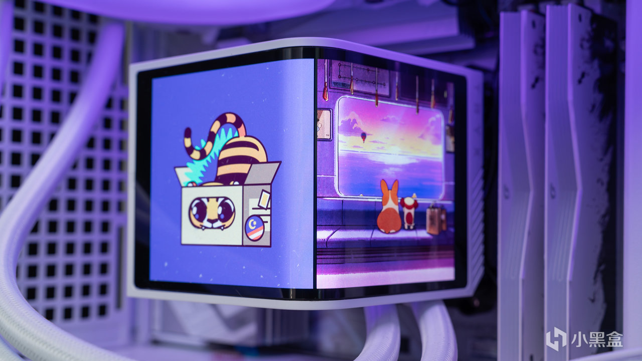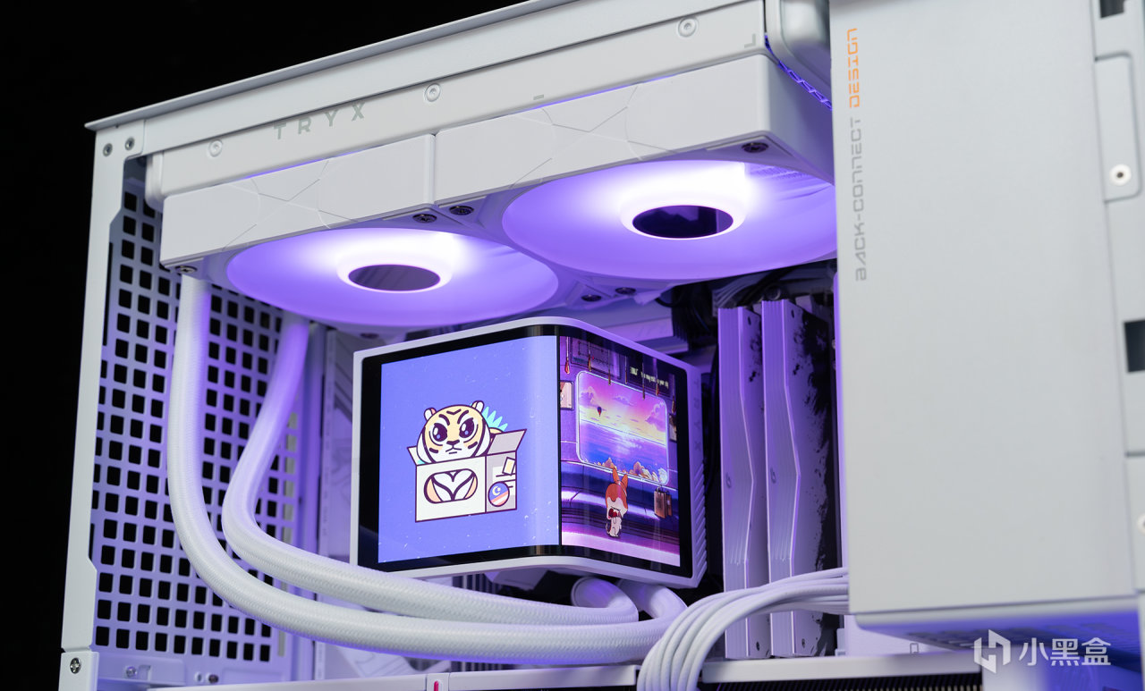 屏幕背面可見散熱孔面積覆蓋完全,可保證這塊AMOLED屏長時間穩定工作,它還具備特別的磁吸支架,方便拆裝之餘也可迎合不同裝機方案匹配的冷頭朝向,其中瀑布模式就是在90°旋轉水冷頭實現的。