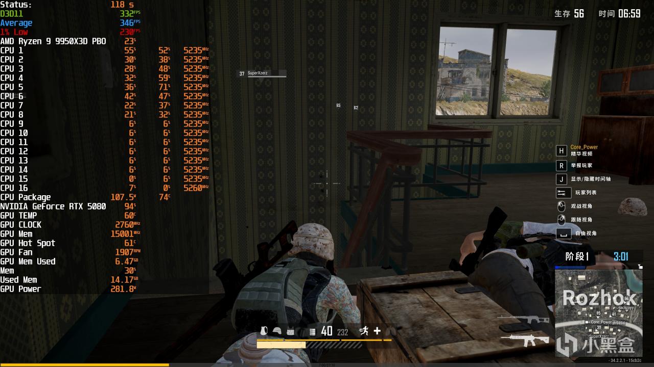 銳龍9 9950X3D+iGame GeForce RTX 5080 Ultra W OC,在4K《絕地求生》自定義三超高畫質100%渲染,平均幀數達到346fps,1% LOW幀230fps