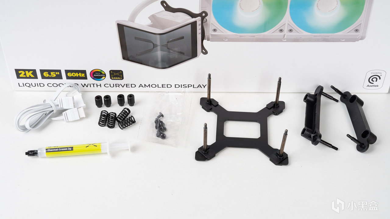 展域SE 240 ARGB配件一覽,包括整合供電線材、2g容量的α-01導熱硅脂、冷排螺絲、螺帽、彈簧件、Intel底板以及AMD扣具。