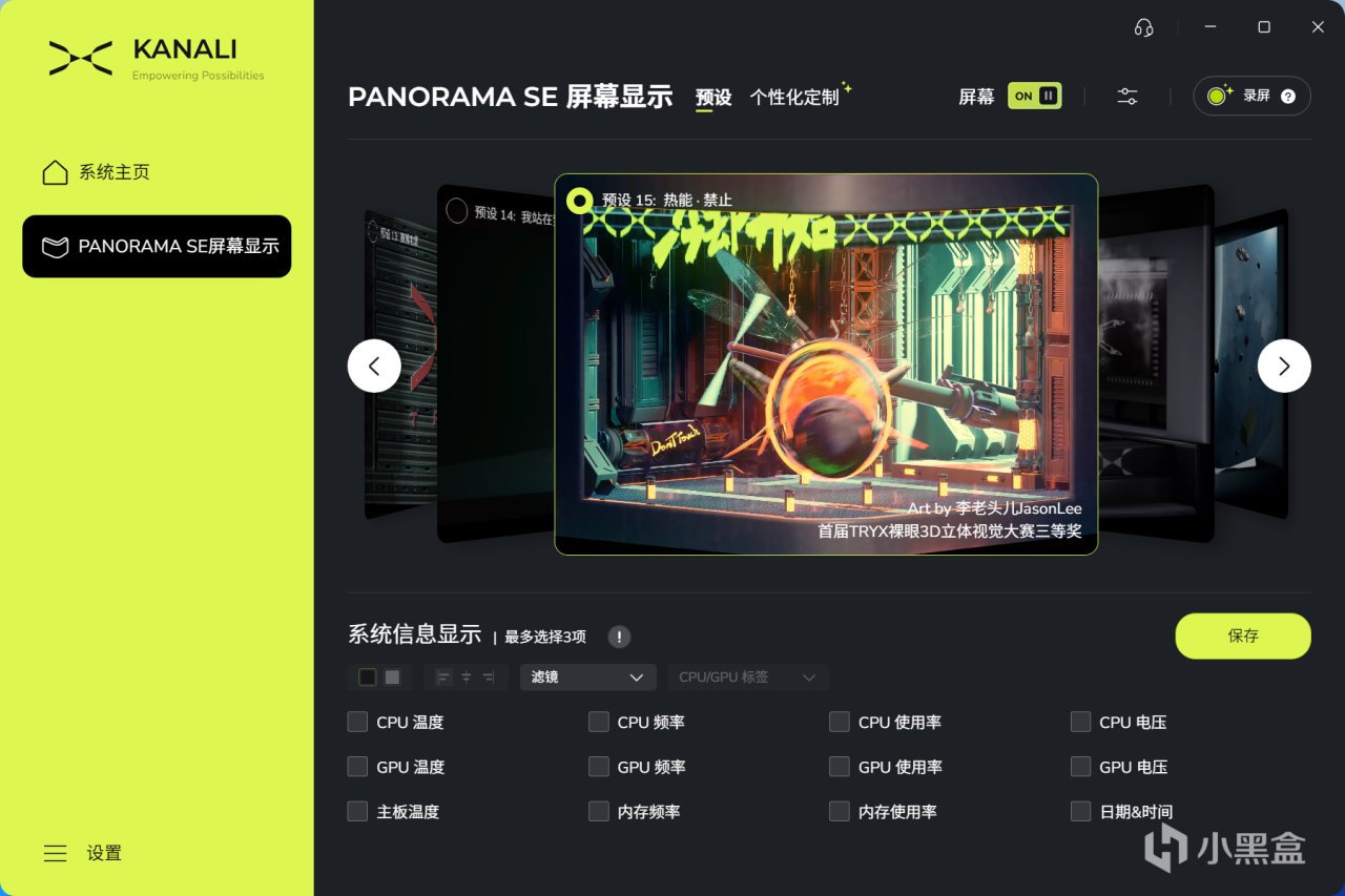 最後比較值得一提的是TRYX創氪星系這款KANALI調控軟件,在UI設計簡潔清爽之餘,功能模塊也相當豐富,預設3D視頻是通過滑動的方式選擇,目前包含官方和玩家作品總計提供了15個預設3D視頻可選,在下方則是系統信息顯示選項,可爲屏幕加入雨天和煙霧濾鏡,也支持鏡像和瀑布模式,不過瀑布模式目前適配的3D視頻只有一款~