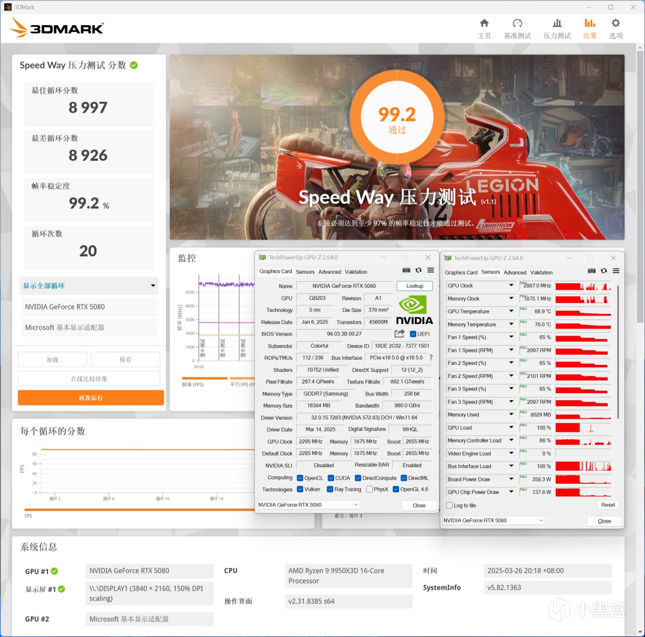 談完CPU散熱表現接下來是顯卡,使用光柵和光追混合的項目Speed Way壓力測試驗證,最終七彩虹iGame GeForce RTX 5080 Ultra W OC可通過率達到99.2%,最佳和最差循環分數僅相差0.7%,說明滿載頻率穩定度是相當高的。