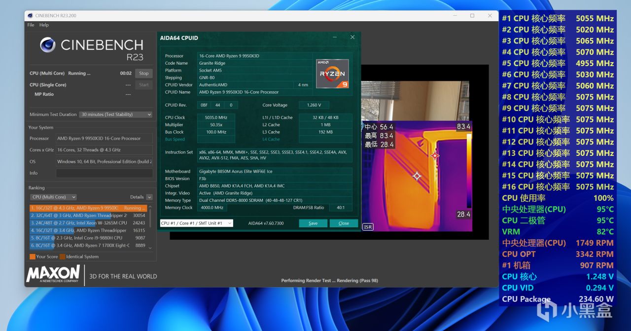接着驗證一下這款主機能否充分發揮銳龍9 9950X3D的性能——使用CINEBENCH R23多核項目烤機30分鐘,在開啓PBO ENABLE狀態,9950X3D穩定在儘可能高的頻率(浮動在5.0~5.1GHz之間)所以會接近TJMAX溫度牆。