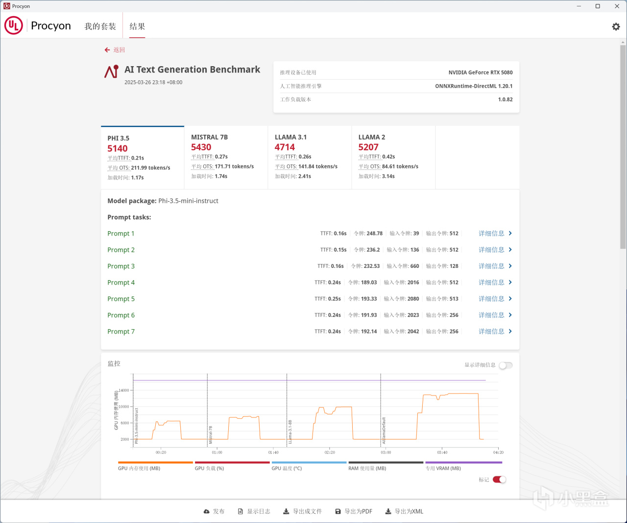 iGame GeForce RTX 5080 Ultra W OC在UL Procyon的AI Text Generation Benchmark大語言模型文本生成測試中,PHI 3.5、MISTRAL 7B、LLAMA 3.1、LLAMA 2分別得分5140、5430、4714、5207,表現相當優異。