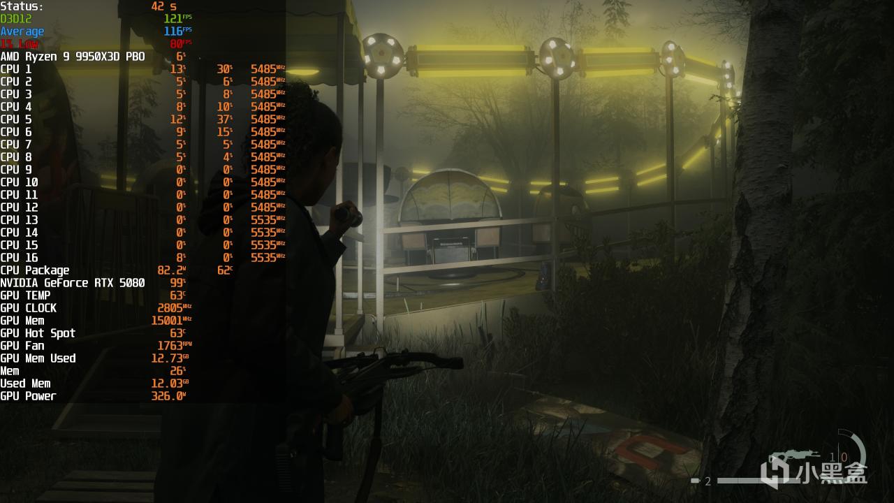 銳龍9 9950X3D+iGame GeForce RTX 5080 Ultra W OC,在4K《心靈殺手2》預設最高畫質+極致光追(Transformer模型)+DLSS質量+4X幀生成,平均幀數達到116fps,1% LOW幀80fps