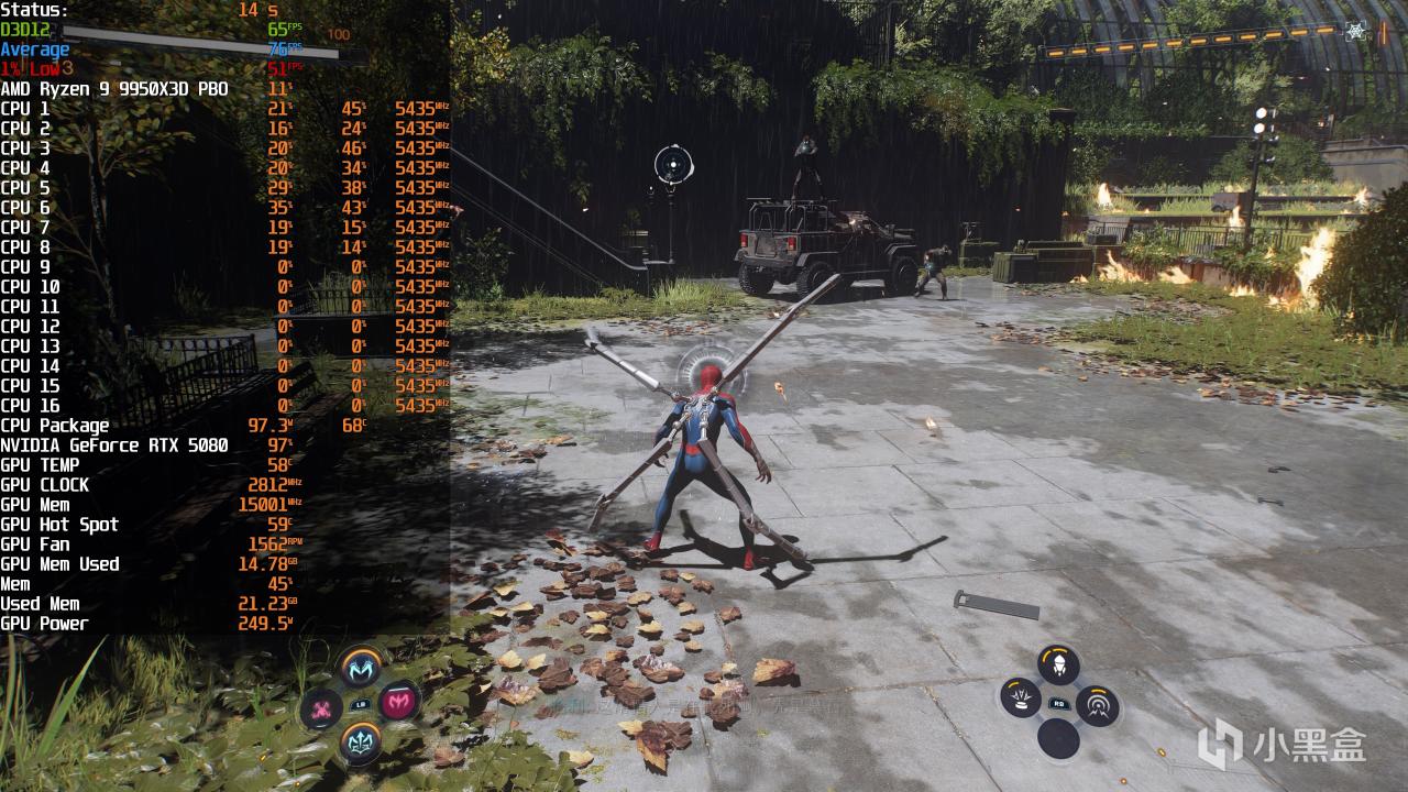 銳龍9 9950X3D+iGame GeForce RTX 5080 Ultra W OC,在4K《漫威蜘蛛俠2》預設極高畫質+終極光追(DLSS光線重構、Transformer模型)+DLSS質量+幀生成,平均幀數達到76fps,1% LOW幀51fps