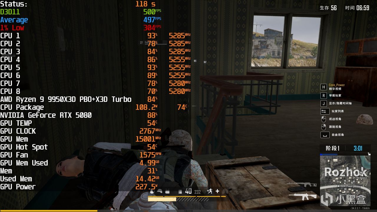 銳龍9 9950X3D(開啓X3D Turbo Mode)+iGame GeForce RTX 5080 Ultra W OC,在2K《絕地求生》自定義三超高畫質100%渲染,平均幀數達到497fps,1% LOW幀304fps