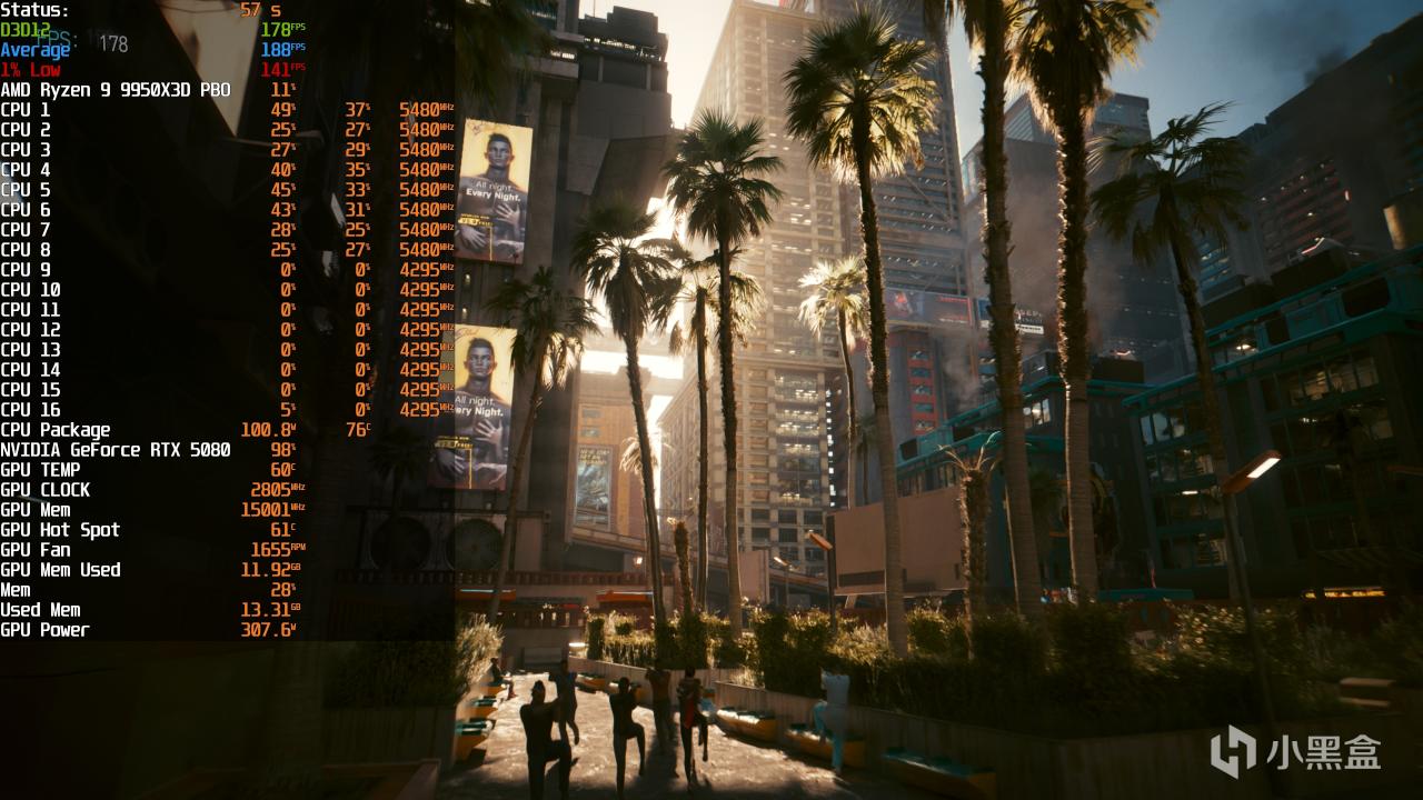 銳龍9 9950X3D+iGame GeForce RTX 5080 Ultra W OC,在4K《賽博朋克2077》預設光線追蹤:超速畫質(Transformer模型)+DLSS質量+4X幀生成,平均幀數達到188fps,1% LOW幀141fps