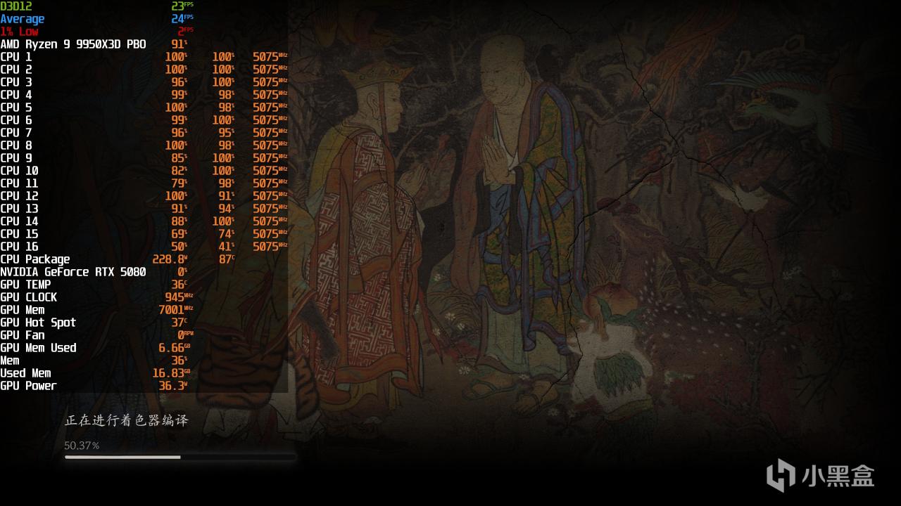 銳龍9 9950X3D核心調度策略是相當智能的,即便識別到的是遊戲程序,但在着色器渲染環境需要儘可能用到CPU性能,亦可將把銳龍9 9950X3D幾乎全核心跑滿來換取更短的渲染時間,而着色器渲染完正式進入遊戲後,核心優先級又會重新回到3D V-Cache CCD上。
