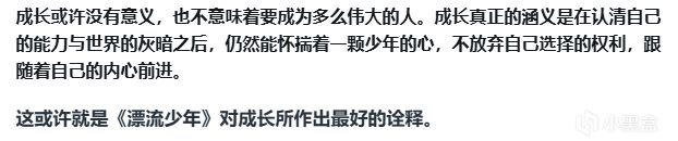 發現了嗎,儘管《漂流少年》從未直接將他所想的觀點灌輸給觀衆,但他卻通過劇情的誘導,“逼迫”觀衆去理解他所想表達的一切,這也是製作組在創作這部作品時手法非常高超的一點。