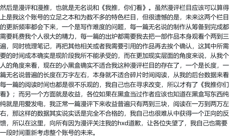 其實就在前段時間我自己也是發了一個更新計劃聊了下最近的狀況,在那裏我也提到說自己未來也是要將【無名說】這個欄目的優先級下調,甚至考慮到了永久停更的一個可能性。原因也很簡單嘛,無非就是盒子的創作激勵實在是過於慘淡,你認真寫出來一篇文章最後只有幾千甚至幾百的流量,這對於一個創作者而言毫無疑問是無法接受的。