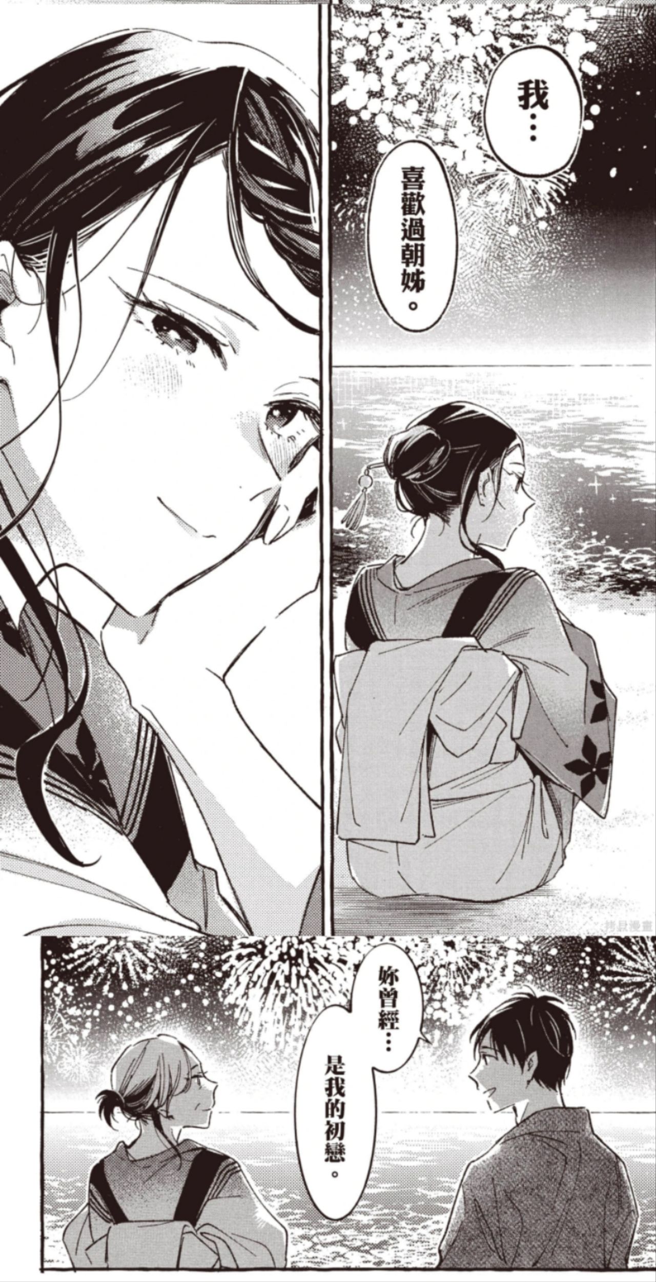 在黃昏中,將司與朝姐進行了長談,除去了過去自己心中無法解開的心結。男主最後承認自己就是個小鬼,朝姐也說自己就是個普通人,在絢爛的煙火下,將司說出了自己遲到多年的表白,少年時期的愛戀如同煙火一般絢爛,卻也如煙火一般短暫。花火的痕跡終將消失,但年少的愛戀卻永遠留在了少年的記憶當中。