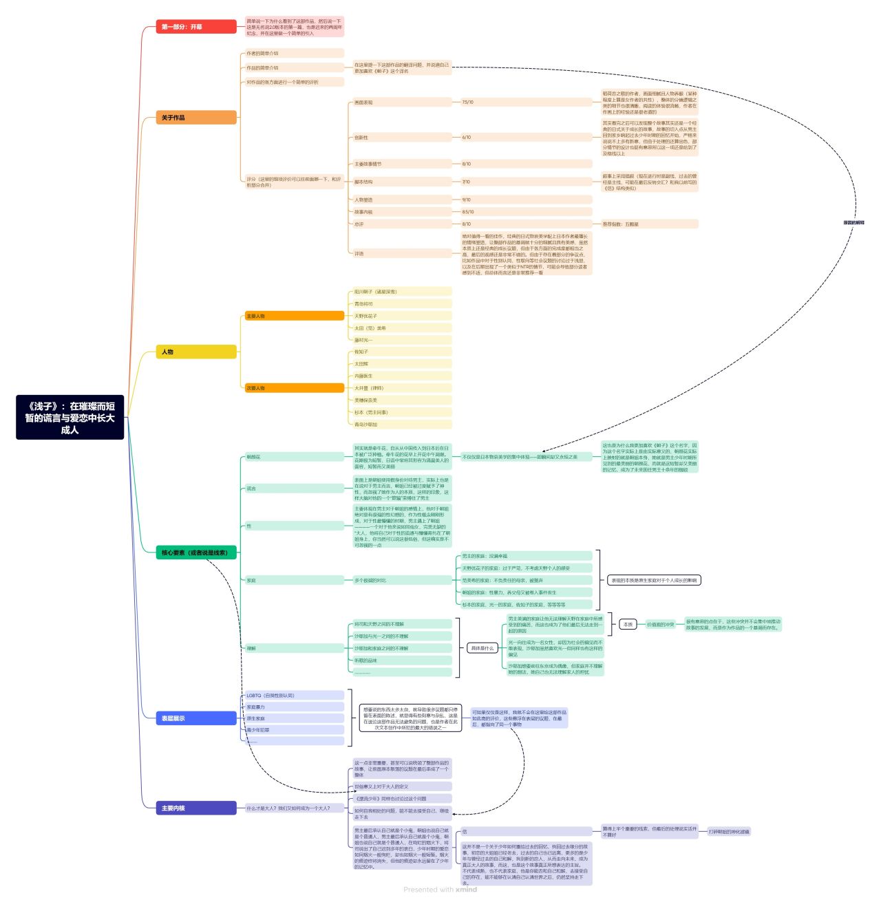 評語:絕對值得一看的佳作,經典的日式物哀美學配上日本作者最擅長的情緒塑造,讓整部作品的基調就十分的細膩且具有美感,雖然本質上還是經典的成長議題,但由於各方面的完成度都相當之高,最後的觀感還是非常不錯的。但由於存在着部分的爭議點,比如作品中對於性別認同,性取向等社會議題的討論過於淺顯,以及在後期出現了一個類似於NTR的情節,可能會導致部分讀者感到不適,但總體而言還是非常推薦一看。