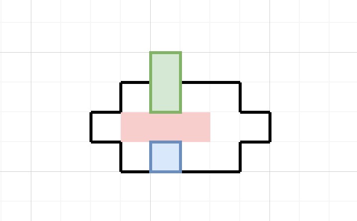 注意到,在过关状态中,两个1x1的块都位于谜题从上到下第三行,但初始状态并不是这样的(蓝色的块在第三行外),所以必须存在一个瓶颈步骤,让两个1x1的块全部进入第三行。第一个1x1的进入有很多方法,但在这里非常值得考虑的是,第二个1x1是怎么进入第三行的。