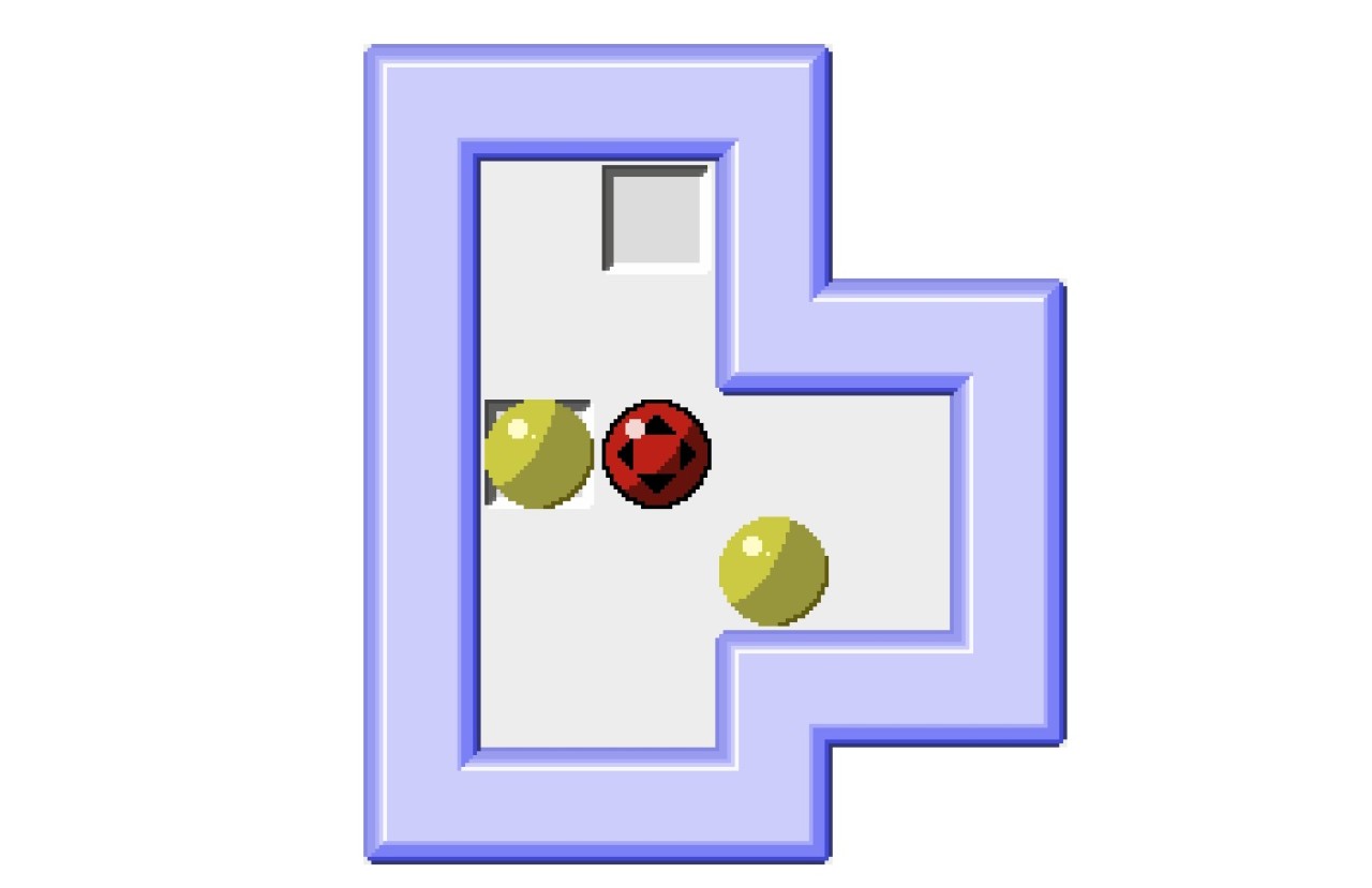 Microban是由David W. Skinner设计的极简纯推箱谜题集(可以在itch.io上搜索),其中的第一个谜题(上面截图中的谜题)已经成为了Thinky解谜圈内的经典梗。在上面的图片中,红色的是可操纵的主角,黄色是“箱子”,而方形的是箱子要被推到的目标。虽然对于推箱老手来说,这个谜题随随便便就可以做出来,但是用它来演示老手背后可能的逻辑过程,我觉得非常合适。
