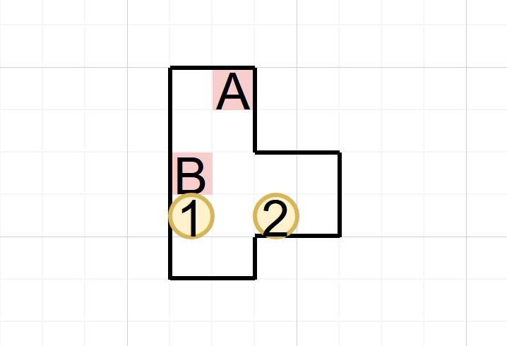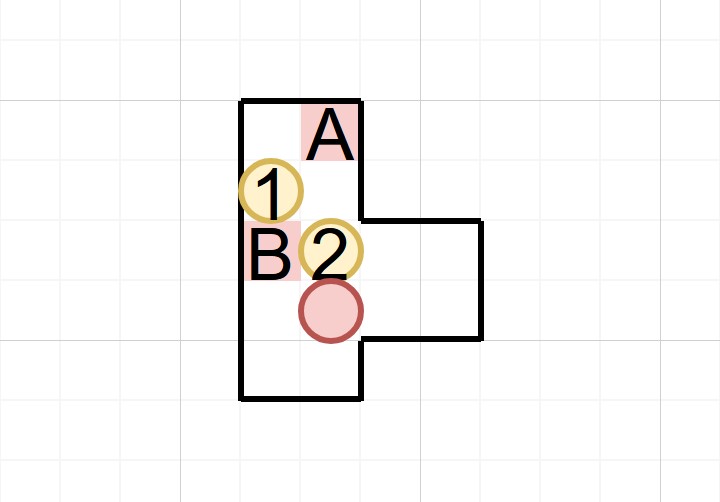 首先我们可以立刻倒推:在最终状态下,两个箱子要分别到达两个目标格,可是每个箱子分别对应哪个目标格呢?利用一个简单的高级结论——箱子1在这种情况下不可能离开左边墙壁——我们可以立刻得到,目标A只能由箱子2来到达(因为箱子1到不了),那显然目标B就和箱子1对应了。