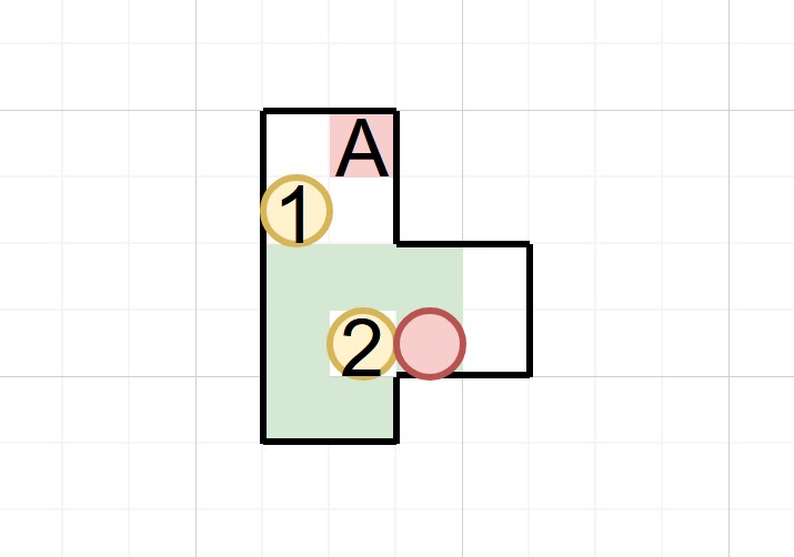 先忽略箱子1的位置,单纯看主角(红色圆)在向左推箱子2之后,又要把它向上推,中间需要经过哪些格子,显然是图中绿色的那些位置。那如果已知这些格被占用、箱子1不能卡在角落、箱子1不能离开左边墙壁所有这些结论,那么箱子1在这个状态下只能有一个可能的位置,那就是上图中箱子1的位置。那么这个瓶颈状态就被完全确认下来了,这个状态必须被经过,而且在将箱子2向上推之后的下一个状态是: