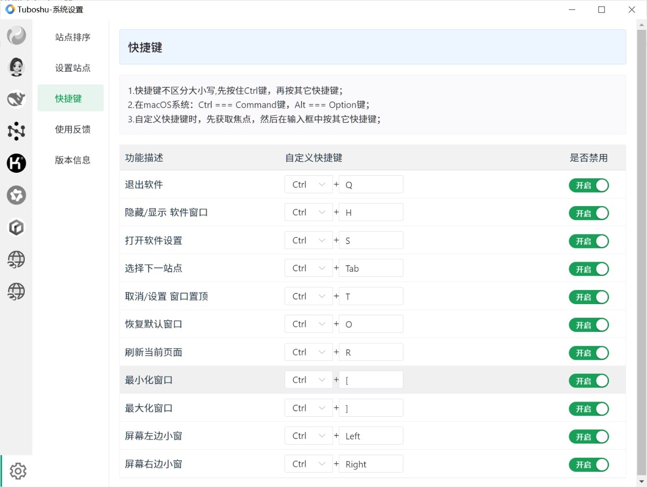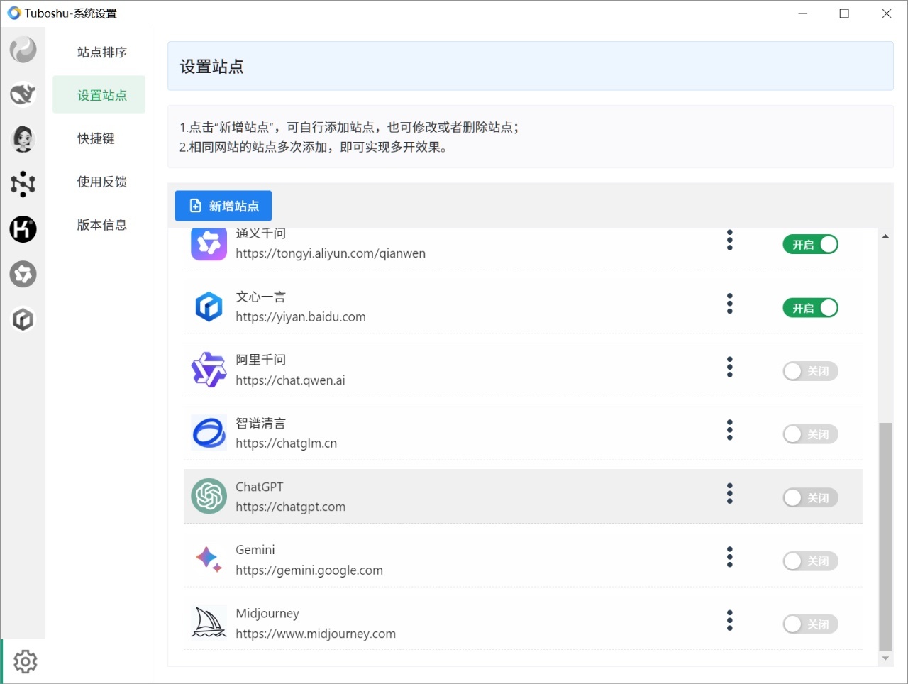Tuboshu在主流的三大電腦系統上都能用,下載安裝之後是這個界面,默認聚合了一些常用的AI,許多特殊訪問的在設置裏需要手動打開。