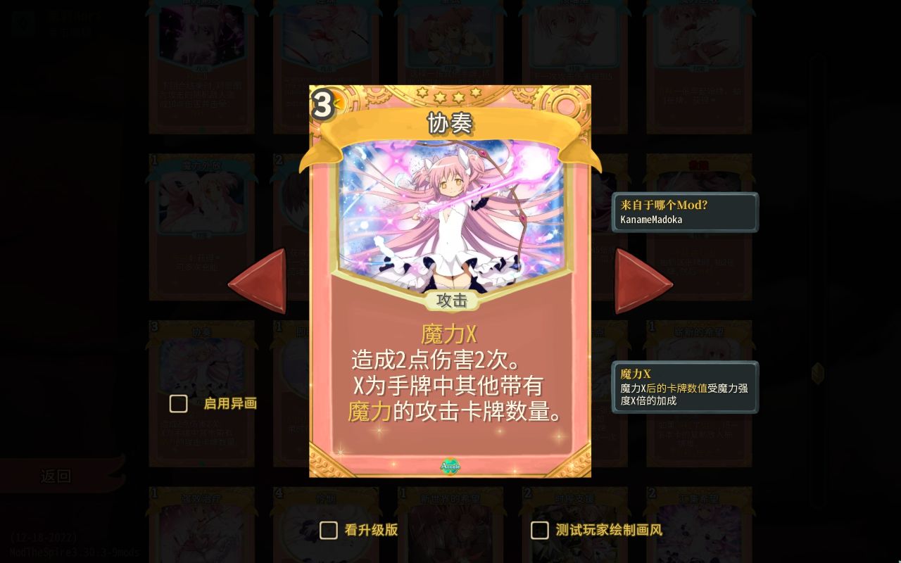 在黑暗與希望交織的世界裏,從簽訂契約,成爲魔法少女的那一刻,命運的齒輪便開始悄然轉動。作爲小圓的粉絲,是否爲承載因果、成爲圓環之理的小圓感到惋惜?沒有關係,在我們的殺戮尖塔,魔法少女鹿目圓香,復!活!堂~堂~復!活!這是由我朋友elfcelia製作的優質同人人物模組,該模組爲原版遊戲添加了: