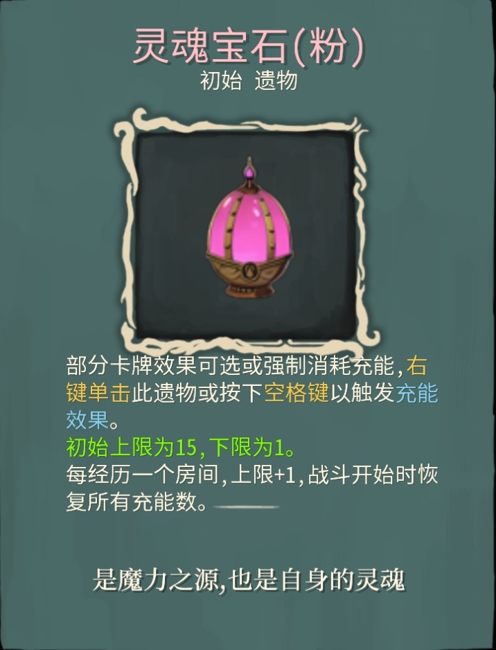 這是這個模組的核心機制,因爲大部分卡牌都要消耗“魔力”或是可以消耗“魔力”。這個靈魂寶石也是角色的初始遺物,等講到遺物的時候再細說