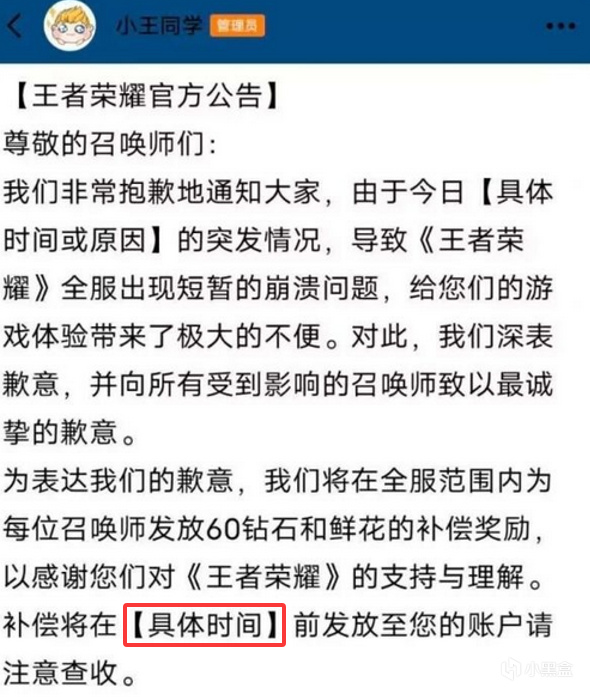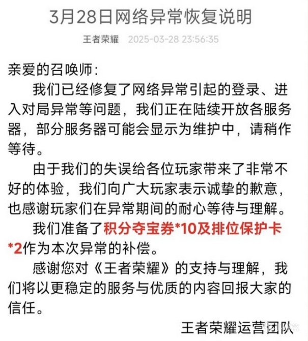 王者榮耀作爲騰訊的老牌現象級吸金手遊,在3月28日罕見的炸服了,出現了無法登陸,無法進入對局的情況,在炸服後,王者榮耀運營火急火燎的發佈了公告,表示因突發情況出現了短暫崩潰,並送上60鑽石和鮮花補償,等等,在啥時候發?具體時間都忘改了是吧,你這公告寫的挺早嘞~