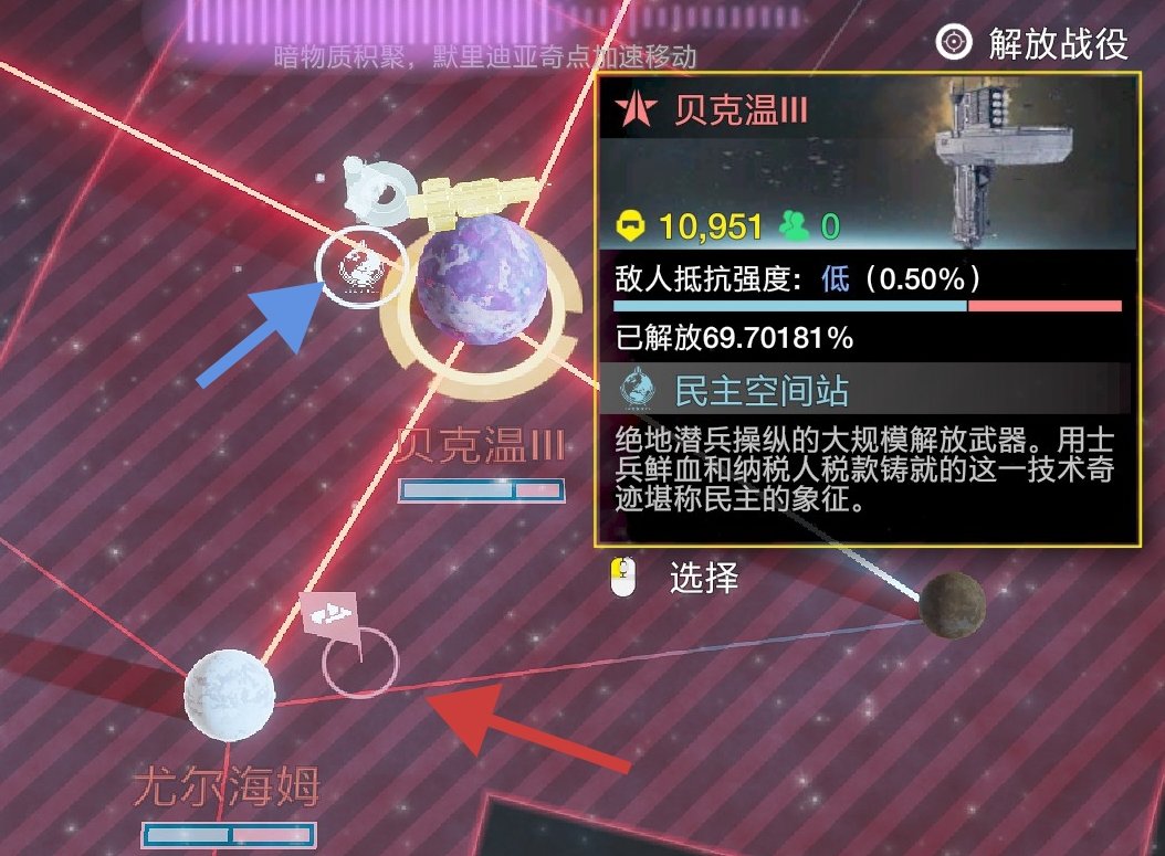 戰役機制將會在之後的節目中介紹,這裏不做贅述。對於萌新而言,只需要知道,星球下方顯示了進度條,就是爆發了戰役,可以前往(如上圖的兩個箭頭);反之則不能前往。