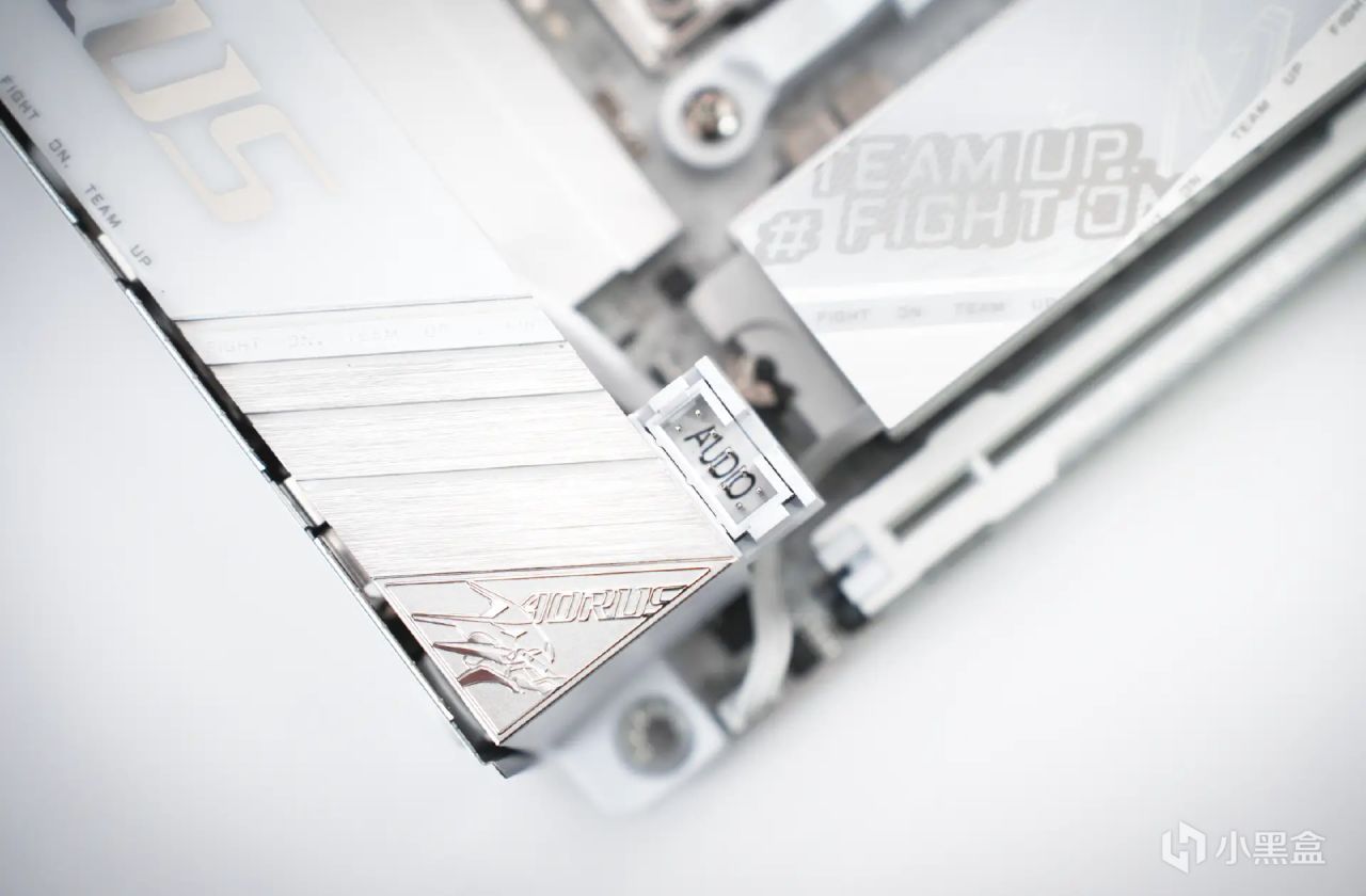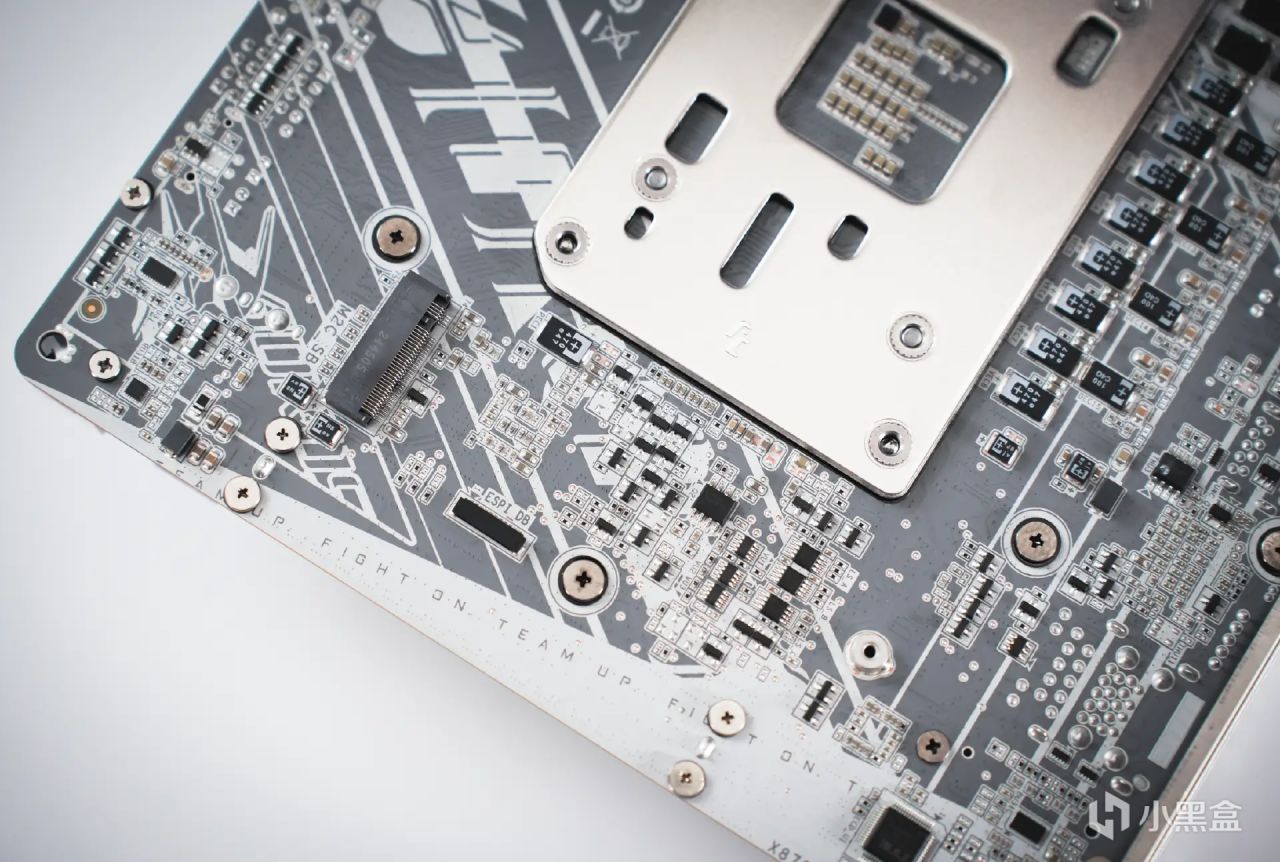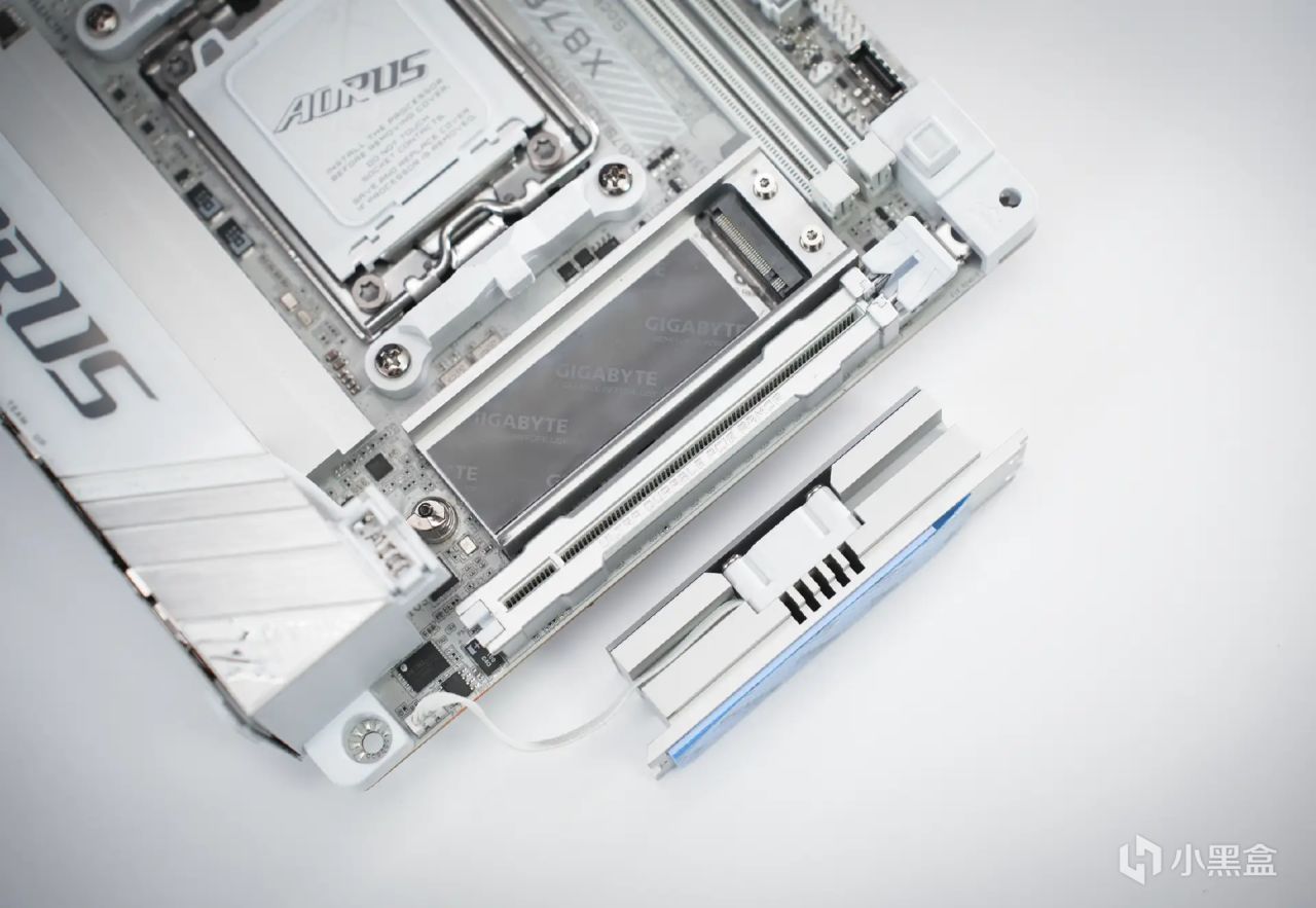 而M.2的設計也是該主板的一大亮點。一共搭載了2個M.2插槽,主板正面的M.2插槽爲CPU直連設計,協議爲PCIe5.0 * 4;主板反面的M.2插槽爲芯片組提供帶寬,協議爲PCIe4.0 * 4。並且同時因爲主板正面的M.2插槽的下方還設有X870芯片組,所以技嘉不但爲其專門設計了個大尺寸的散熱馬甲,並且內部還搭載了一個主動散熱風扇,進一步降低整體溫度。