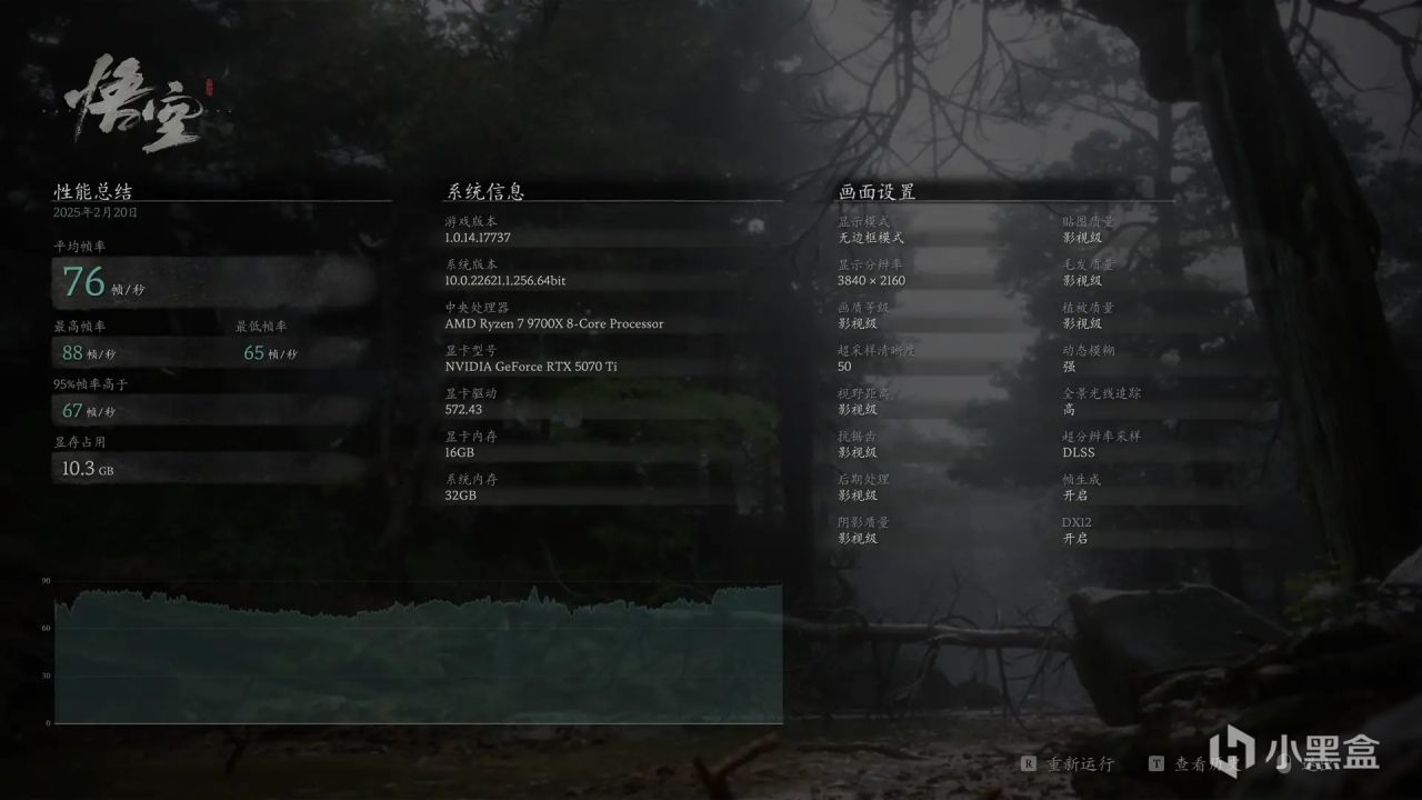 目前該遊戲還沒有更新DLSS 4.0的補丁,在4K分辨率+影視級+超採樣清晰度50+全景光線追蹤高+DLSS幀生成的加持下,整機的平均幀數爲76。
