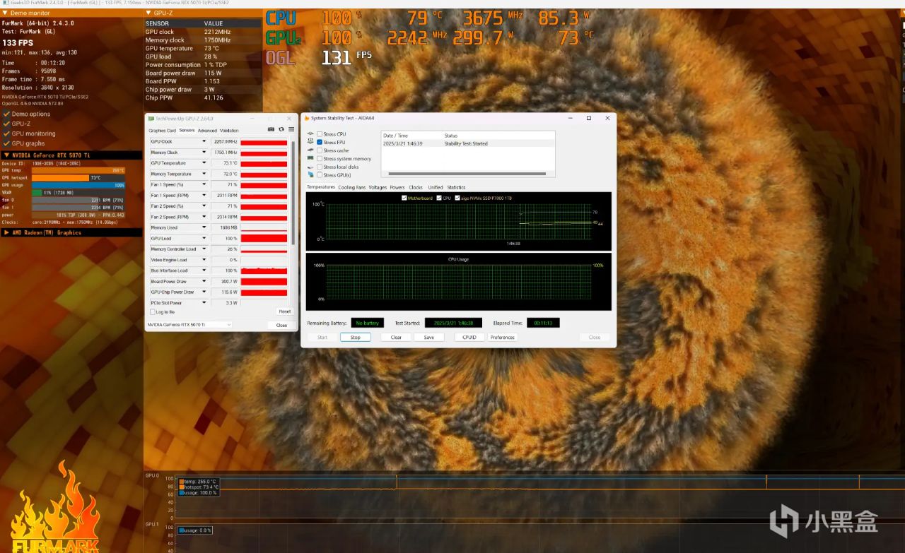 因爲閃鱗S300兩側都是採用的MESH面板,所以整機在散熱方面表現都還不錯。比如通過FURMARK+AIDA64雙烤,CPU核心最高溫度79℃,GPU核心最高溫度73℃。