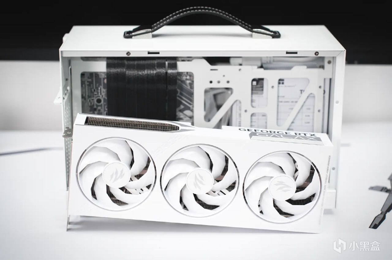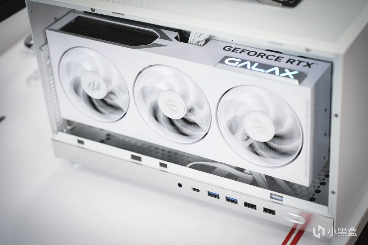 該顯卡是影馳爲RTX50系列打造的全新“刃BLADE”系列,有黑、白兩個版本。其中純白被命名爲聖刃,非常契合本次的裝機風格。當然,選這款顯卡不僅是因爲其純白配色,還因爲其尺寸非常適合,該顯卡整體尺寸符合SFF-Ready標準,爲303mm×112mm×50.5mm(不含擋片),塞入閃鱗S300非常完美。