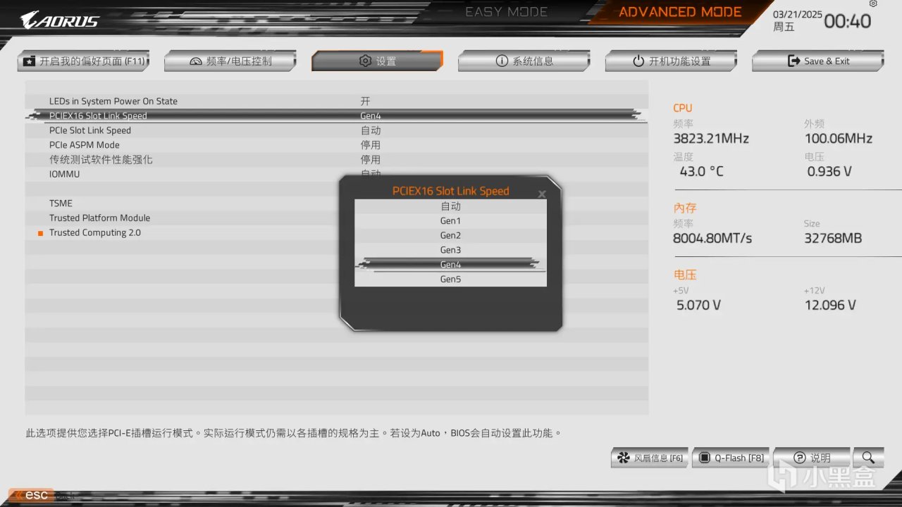 這裏也要強調一下,目前PCIe延長線基本上都是PCIe 4.0延長線,但主板的PCIe接口爲PCIe 5.0 * 16,所以需要提前進入BIOS將PCIe設置爲GEN 4模式。