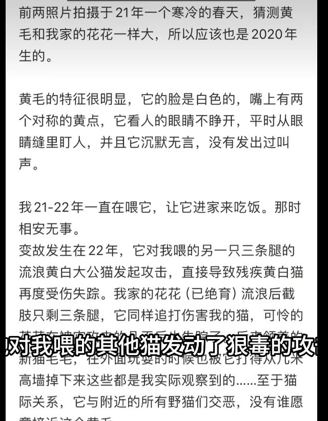 但是隨後它不知道經歷了什麼,到2022年時他就正式進化成了“貓界喪彪”。博主說從那以後,圓頭耄耋開始攻擊博主餵養的流浪貓。如果只是搶東西還好,但是它下手極其狠毒,許多貓都會被它攻擊至受傷,這就導致博主餵養的許多貓甚至出現了因傷去世的情況。