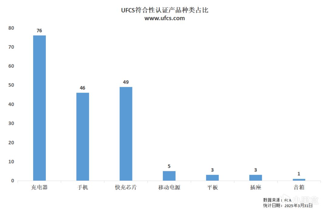 根據最新UFCS認證產品統計數據,截至2025年3月31日,全國共有 183 款產品通過UFCS融合快充符合性認證,涉及 40 家企業的 46 款手機、3 款平板、1款音箱、76款充電器、5 款移動電源、3 款插座和 49 款芯片產品。