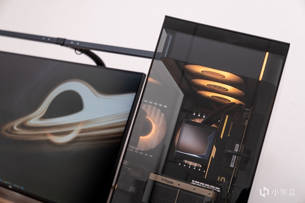 顶部的RGB导光条内部有8个独立灯光区域,支持1680万色,自带10多个灯效,支持主流厂商的主板ARGB 神光同步,分段式的散热装甲嵌入设计配合柔光雾面工艺,整体灯效柔和且绚丽。