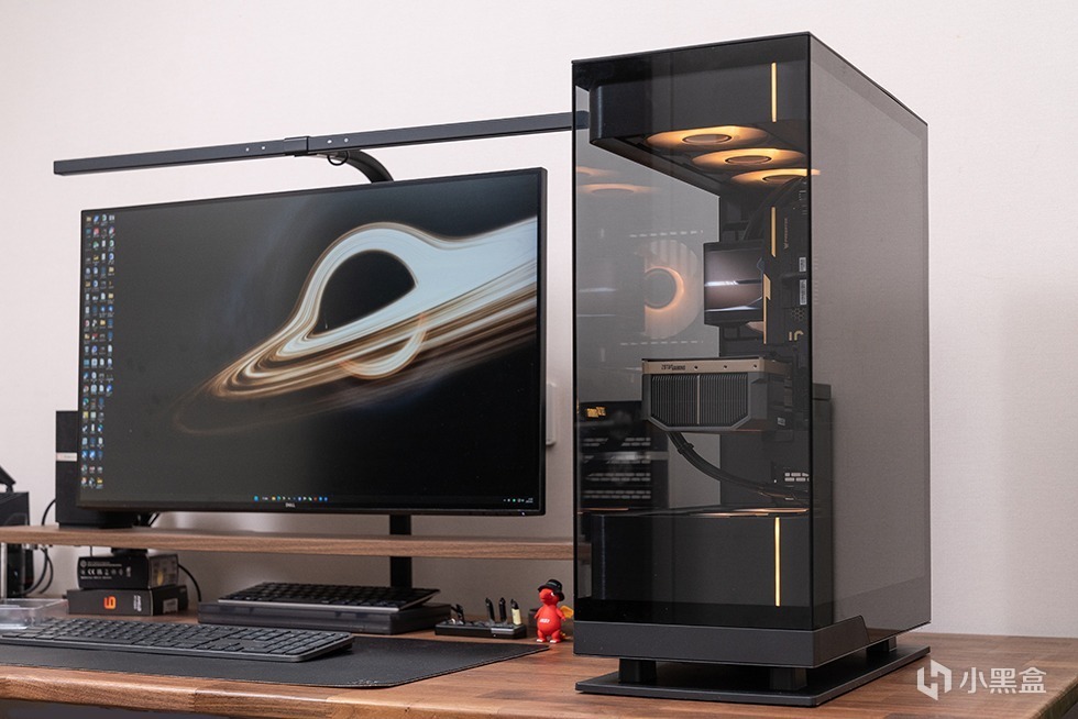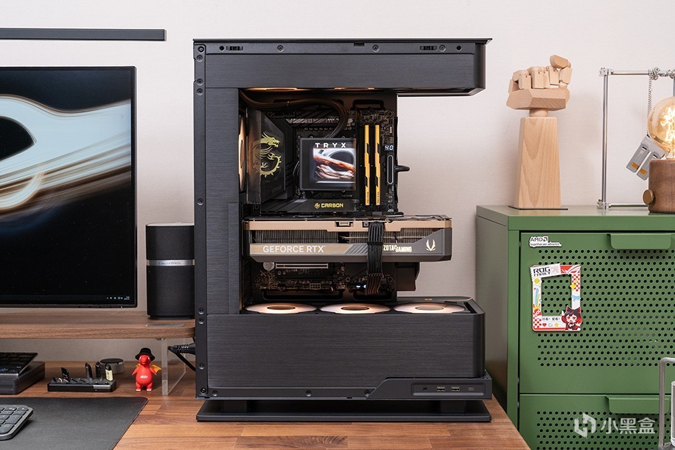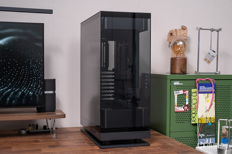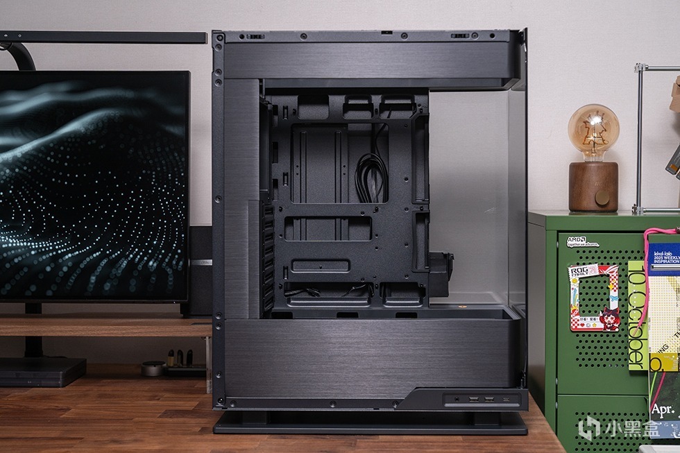 追风者EVOLV X2机箱提供黑白双色可选,适配不同风格的主机主题。本次装机为黑色,整体尺寸为454×452×360mm,采用三面4mm钢化玻璃面板 (前、左、右侧),结合铝制拉丝工艺边框,提供双270°无遮挡视野,内部硬件一览无余,呈现出通透的“海景房”视觉效果。