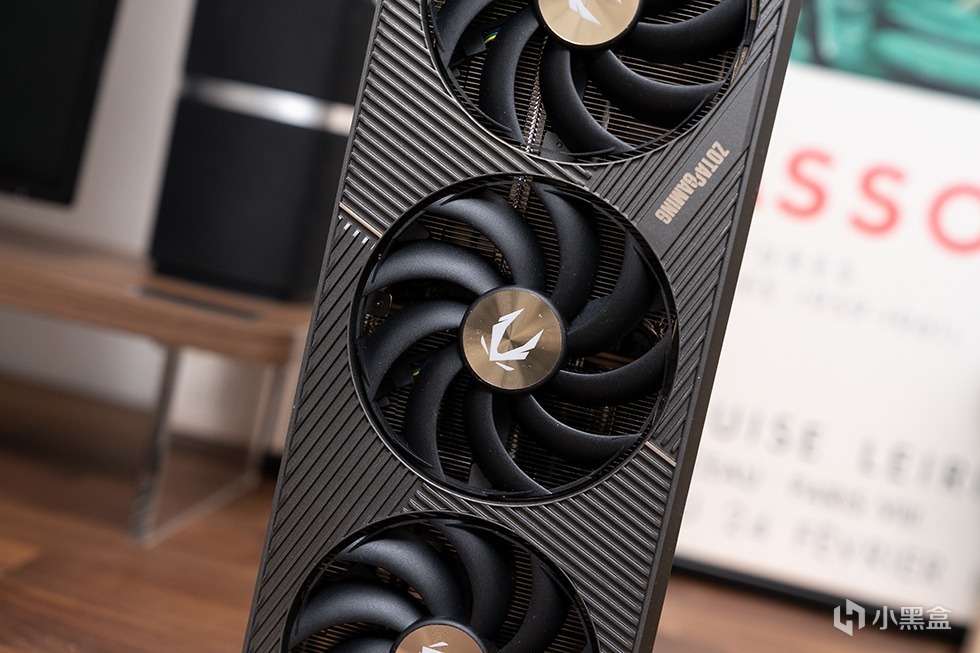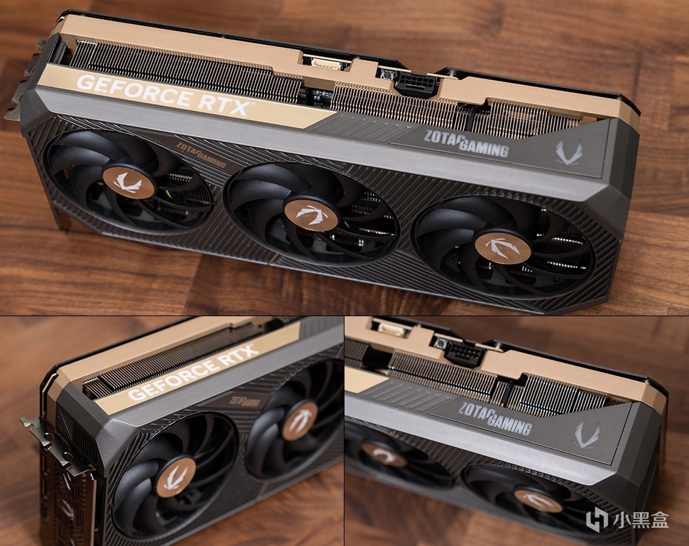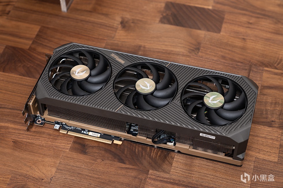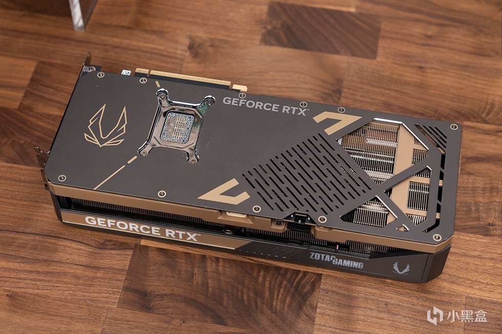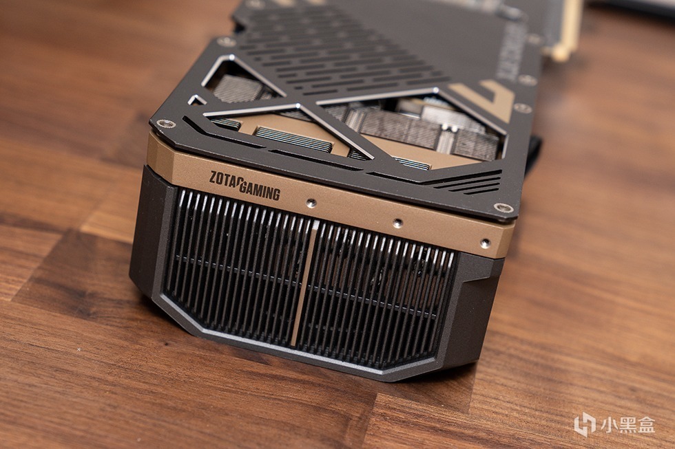 索泰GeForce RTX 5080 16GB SOLID OC显卡采用全新的灰金配色,造型硬朗而方正,彰显低奢耐用的风格。正面最为引人注目的是三颗直径为9厘米的环叶风扇,轴心中央配有金色标识。导风罩由高强度新型复合材料制成,表面采用交叉斜纹栅条设计,中央位置以暗金色线条划分,并点缀同色“ZOTAC GAMING”字样,整体视觉层次丰富且充满立体感。
