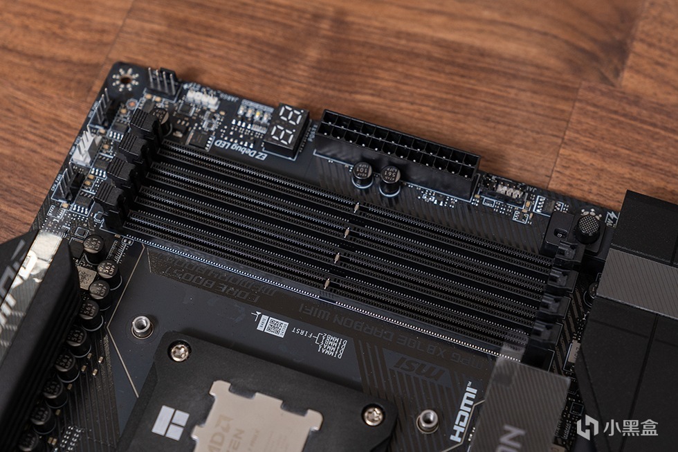 微星MPG X870E CARBON WIFI暗黑主板在内存方面采用4*DIMM双通道设计,单槽最大容量支持64GB内存,插满四槽可达256GB。官方标称OC频率达8400MHz+,采用独立内存供电模块和SMT贴片工艺,抗干扰能力提升30%