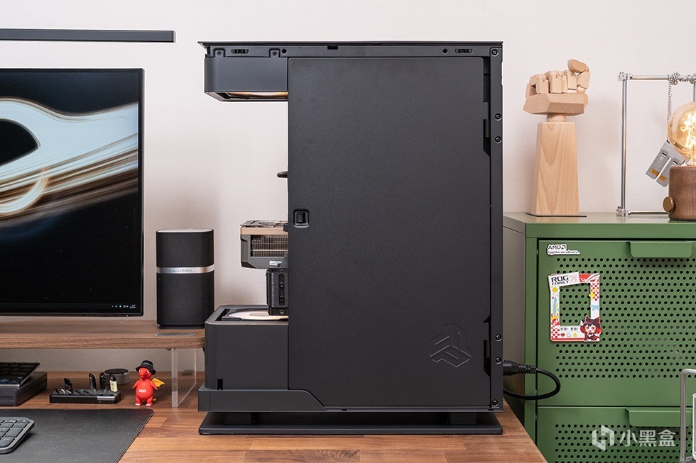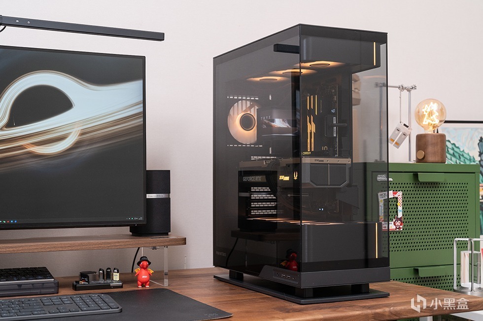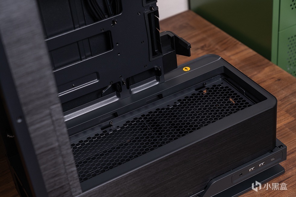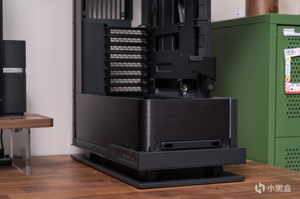 机箱底部采用跃层留空设计,进一步垫高底部空间,有效提高底部进风效率,同时大面积的底部支撑面积使得整机摆放异常稳固。机箱I/O在机箱左侧底部位置,包括两个USB 3.0接口、一个高速USB 3.2 Gen2x2接口、音频和麦克风插孔,方便用户连接各种外设和进行日常操作。