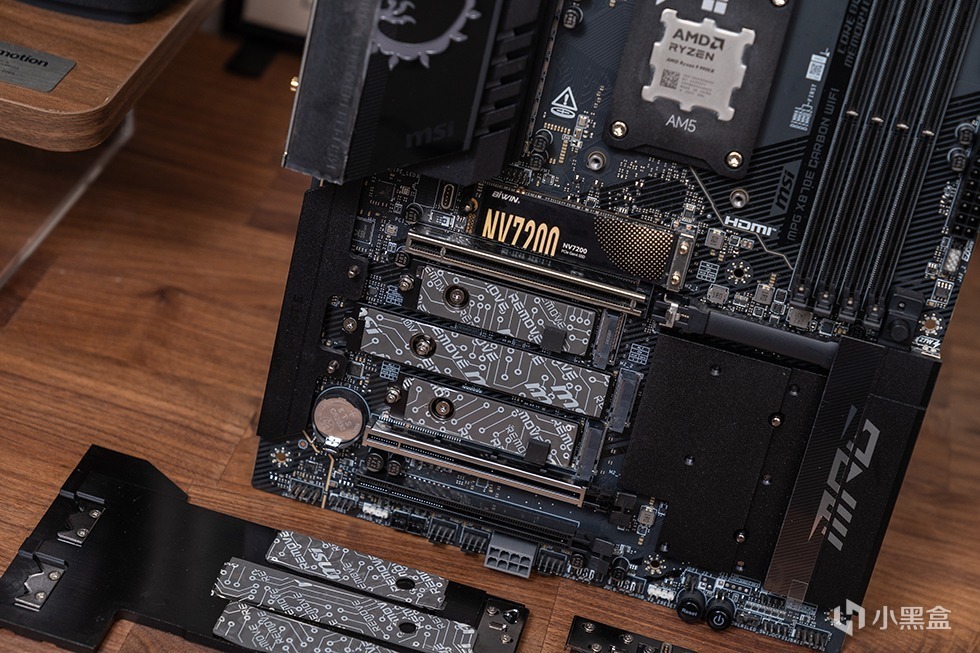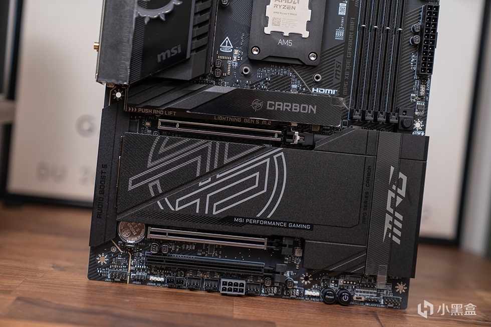 微星MPG X870E CARBON WIFI暗黑主板提供了4个M.2槽位,并为其配置了全新第二代M.2冰霜铠甲。M.2_1和2槽位来自CPU直连,M.2_3、4槽位则由芯片组提供。M.2_1、2为PCIe 5.0 x4 模式,其他2个槽位为PCIe 4.0 x4 模式,其中,M.2_1、4配备了独立的双面M.2 Shield Frozr II散热装甲,M.2_2、3两个槽位共享一块大面积的M.2 Shield Frozr II散热装甲。